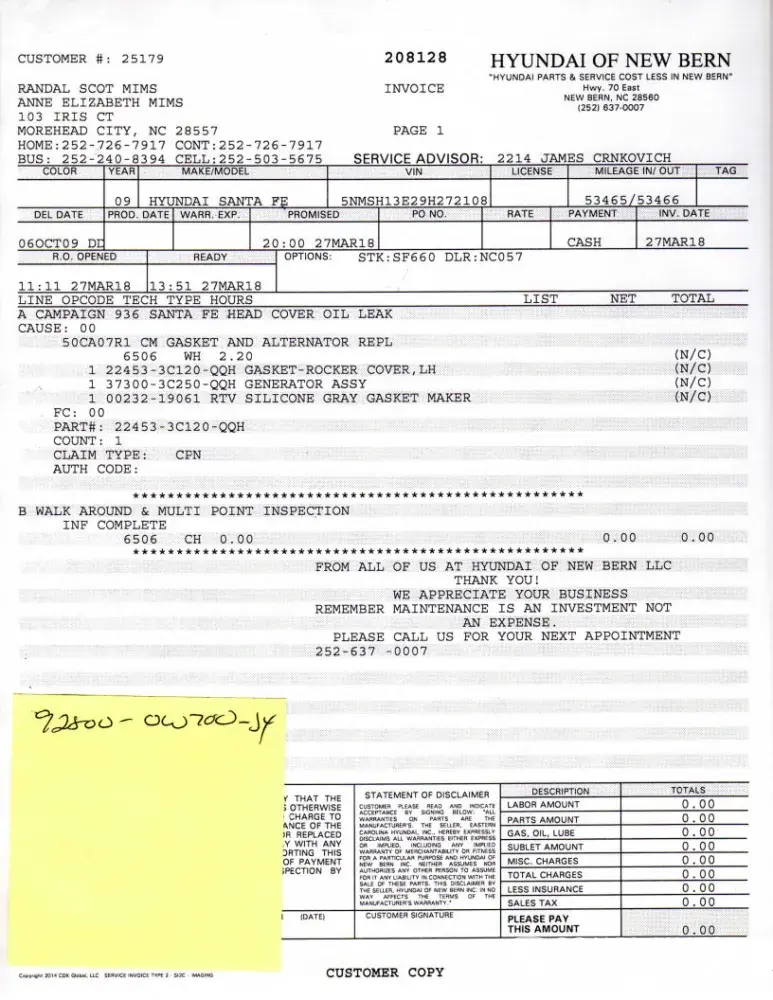 I received a notice that there was a recall on my Santa Fe and took it to Hyundai to resolve the issue. After several months (small leak that had to leak enough to be noticed on my garage floor) I found oil on my garage floor. The leak was very small and depending on the amount of driving another drop may or may not show up due to the wind blowing the oil around the engine compartment. I took it to my mechanic, which spent hours cleaning the engine due to the splattering of oil. It was finally discovered that the recall and replacement of my valve cover gasket was poorly done, causing the leak. And now Hyundai denies any responsibility!