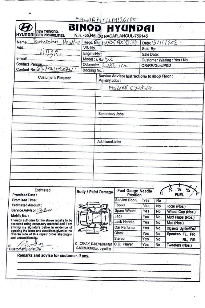 No spare parts available in Binod Hyundai, NH 55, NALCO Nagar, Angul, Odisha, Pin - 759145. While I am travelling from Bhubaneswar to Angul, NALCO, at the near place of Angul town my car above model has defect. Then I deposit my vehicle Binod Hyundai, NH 55, NALCO Nagar, Angul, Odisha. Now I am travelling by Auto Rickshaw due to non available the spare part in the dealer till date