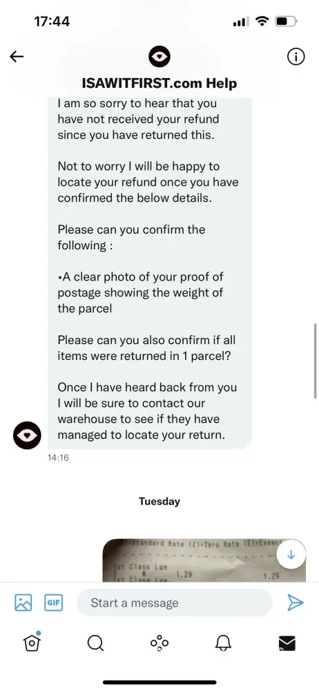 I also then revised customer rights, i utilised the returns label in the bag. I am not responsible once Royal Mail have the parcel when returning back to them. I want my funds back and I will refuse to order from this website again without some sort of Gesture of goodwill. This is frustrating having to chase them constantly when alls I want is a refund for the goods I have not got!