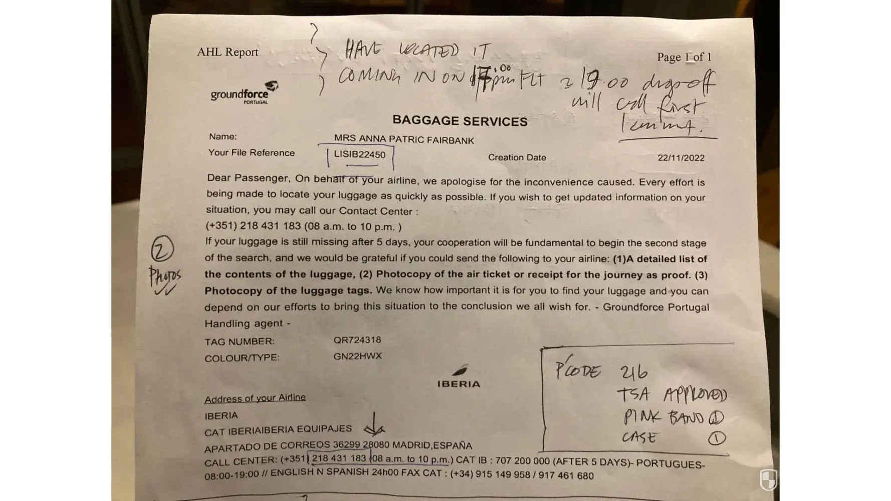 b. I am concerned the ground force officer has details, that he noted bag was found in Madrid and will be sent on a plane (4pm then changed to 5pm), with delivery around 7pm, and the officer noted 9 bags missing.