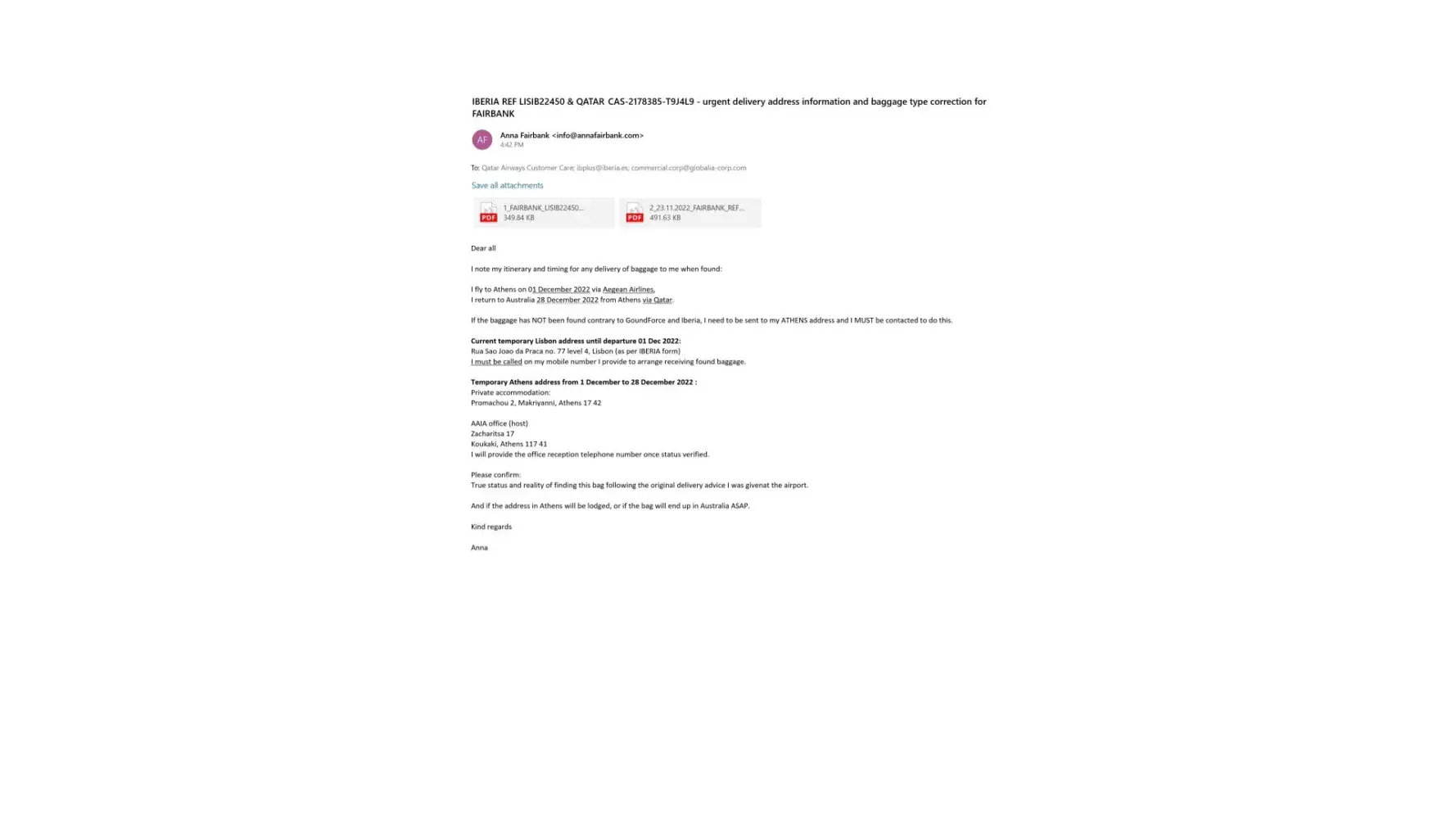 If the baggage has NOT been found contrary to GoundForce/ Iberia, baggage item must be sent to my ATHENS address.