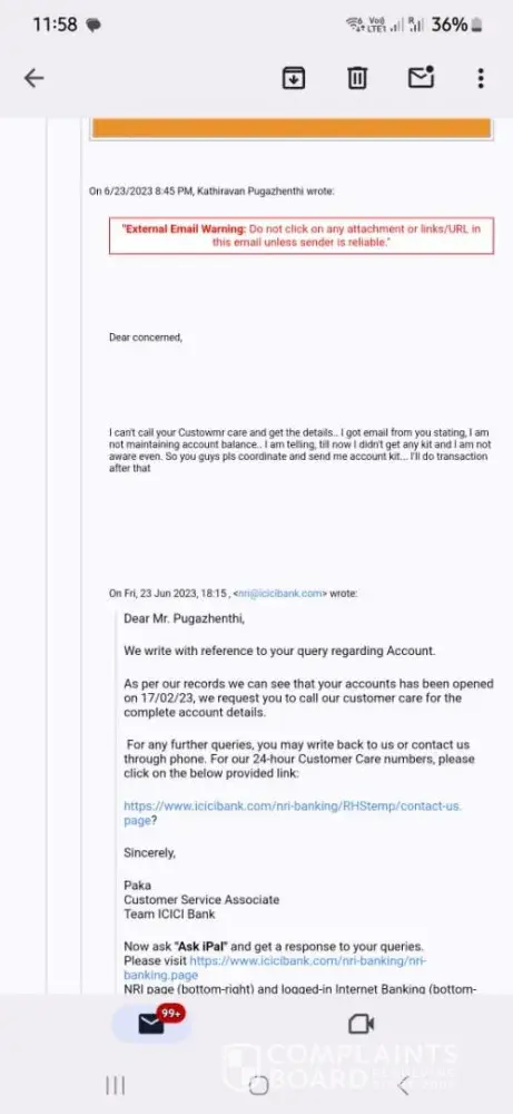 ICICI Bank Account kit also not received. Last one year I am complaining same to ICICI NRI services. But today, they want me to pay 826 Rs as bank charges