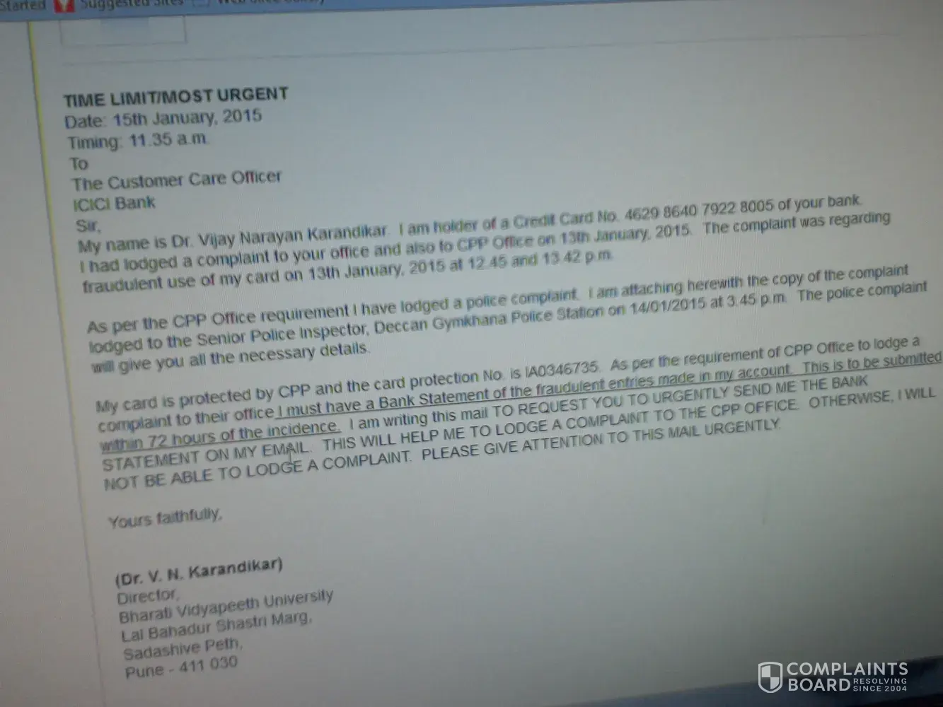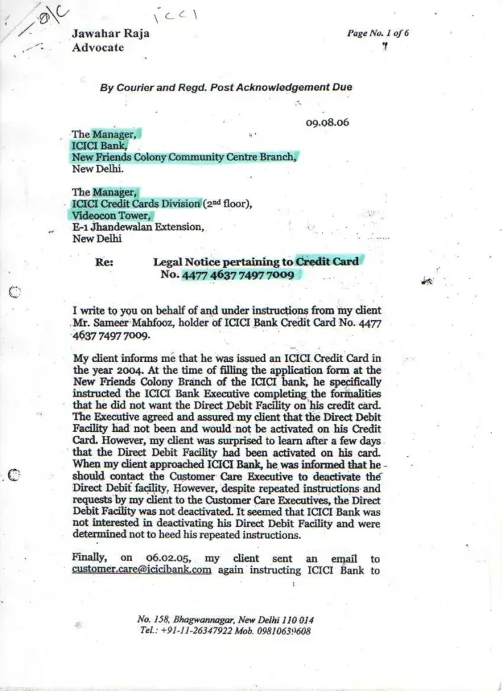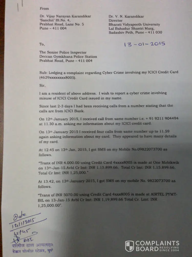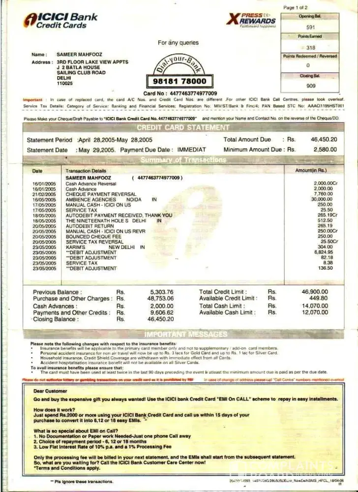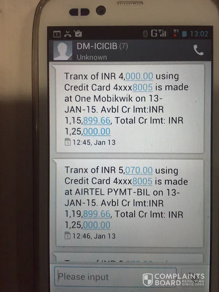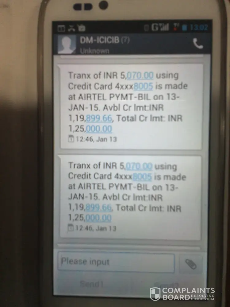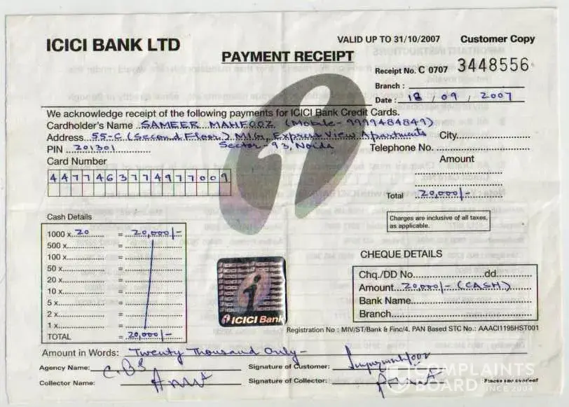 This month I have not received the sms messages regarding payment of credit card. cc no [protected]. and I am not in the city from 15th november to 20th of nov, 2014, 20th nov, i got a voice mail from Icici bank custormer care, payment of cc not yet received please pay the same to any icici bank branch immedietly by cash no charges will be layed. so immedietly i have gone to branch and payed cash.