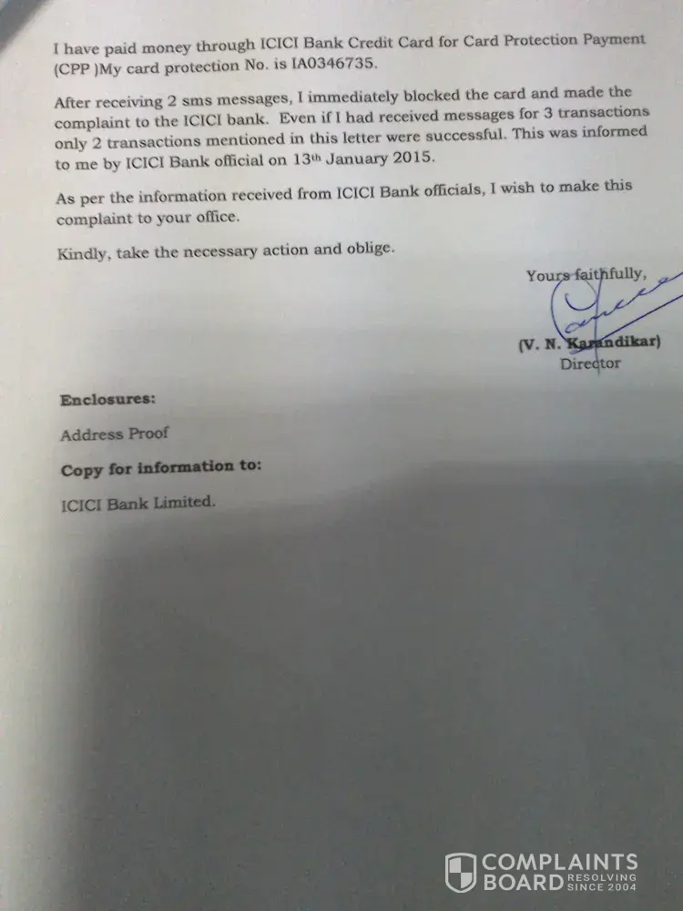 I have been called by some and offered about Card Protection Plan and without my consent debited a sum of Rs 1850/- from my S.B.Account, ICICI Bank. Thereafter, I didn't receive any communication from them and when I called to enquire about the debit of the above amount, they simply said that they are extending Card Protection of my Cards. However, I did not provide the details about any of my Cards and yet they are telling that my Cards are being protected.