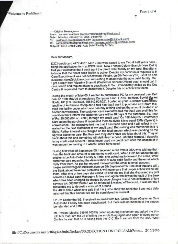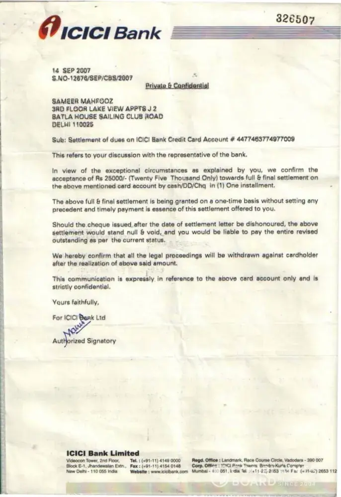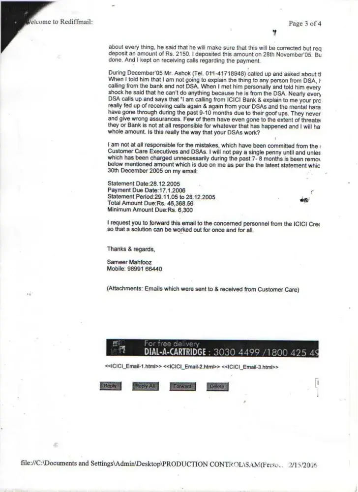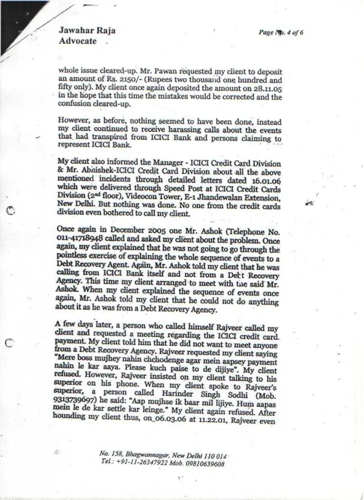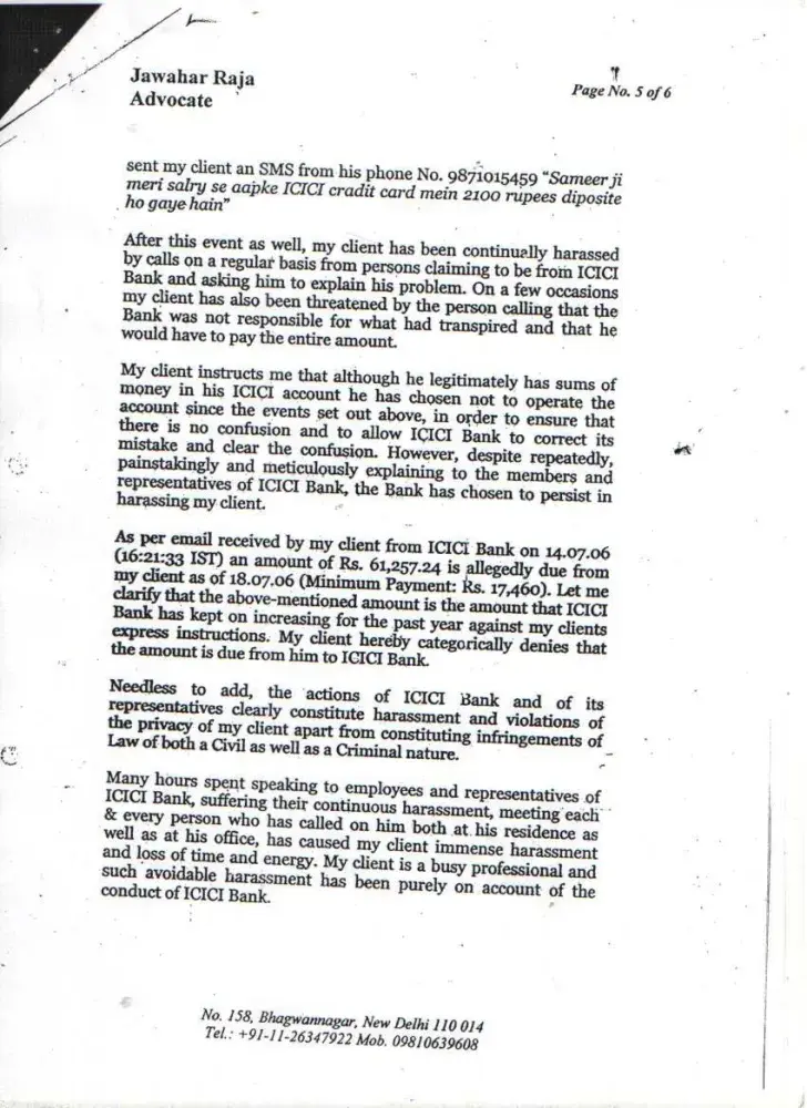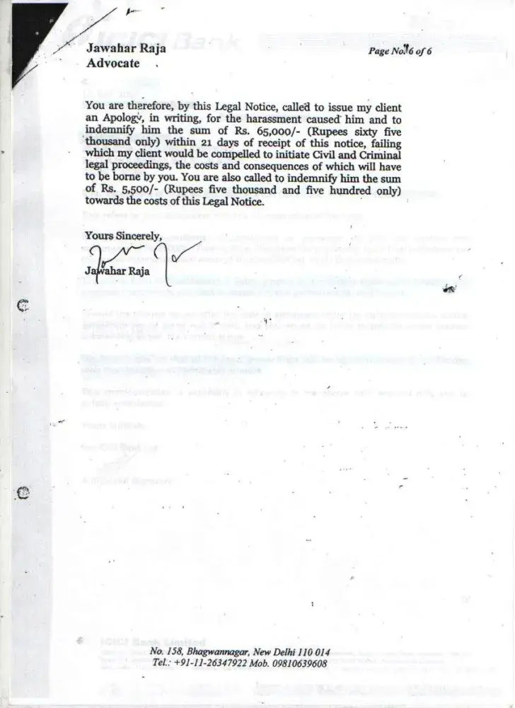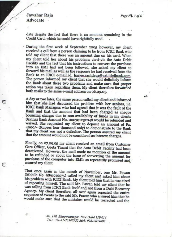 I wanted to buy 1 HCL Computer from Ambience Agencies Pvt. Ltd., F-12A, Savitri Market, Sector-18, Noida on 16th May 2005. Before making the payment, I called up the ICICI Credit Card Customer Care that I wish to get the amount converted in EMIs. I was told by the Executive that this can be done if I call them within 10 days after the purchase. Therefore, I called up again on 18th May 2005 and informed them that I have purchased the computer (Receipt no. 4786) and requested them to get the amount converted into EMIs. But later on when I received the Credit Card statement dated 29th May 2005 (attached), the amount was not converted. I informed ICICI Customer Care but the executive refused. I kept on giving the possible amounts during this time. On 16th January 2006, I sent separate letters (detailed) through Speed Post to Mr. Abhishek & The Manager, ICICI Credit Card Division, Videocon Tower, Jhandewalan, New Delhi explaining all the incidents but no one responded. Also sent an detailed email on the same date to the customer.[protected]@icicibank.com regarding this. On 25th July 2006, I received a legal notice from Mr. I.K.Jha (Advocate) on behalf of ICICI Bank. I kept on getting calls again & again threatening regarding the payments and threatening me of the consequences. When this process of harassment did not stop then I sent a legal notice to The Manager, ICICI Credit Card Division, Videocon Tower, Jhandewalan, New Delhi & The Manager, ICICI Bank, New Friends Colony, New Delhi on 9th August 2008. During this whole period I have always received all the calls from everyone who has called on behalf of ICICI and tried to explain everything. Finally Mr. Bijender called me up from ICICI & said that he is sorry for whatever harassment I went through but now wants to close this matter amicably. We discussed the amounts which I had already paid and then we agreed on the amount of Rs. 20, 000. In return to this he promised me a final settlement letter. But when the executive came to my office (Sriram Center for Art & Culture, Safdar Hashmi Marg, New Delhi) on 14th September 2007, the amount mentioned was Rs. 25, 000. When I called up Bijender, he told me that is a printing mistake and the settlement is Full & Final and requested me to mention this on the slip. He also assured me that he will issue me a new letter ASAP mentioning the amount of Rs. 20, 000 as the Full & Final settlement amount. On this assurance, I handed over CASH i.e. Rs. 20, 000 (Receipt: 3448553) to the executive. Mr. Bijender called up again on 18th September 2007, and informed me that he will not close the matter if I do not pay the amount of Rs. 20, 000 one more time i.e. the total amount for settlement will be Rs. 40, 000. At that point I was under so much pressure, tension and had faced so much harassment that I agreed to pay Rs. 20, 000 (Receipt: 3448556) more to get the Full & Final settlement done. Even after the payment Rs. 40, 000, I did not get any updated letter of Full & Final Settlement from the ICICI. Mr. Bijender stopped taking my calls and the ICICI Bank stopped sending the credit card statements to my rediffmail ID for some time but again I started receiving statements and the amount kept on increasing. I am sending the Xerox of all the related documents. I tried my best to sort this but I was always harassed, pressurized and insulted again & again from the ICICI officials. I was really shocked to see that the amount of Rs. 41, 140 due despite the payment of Rs. 40, 000. I have also requested the CIBIL authorities to intervene ASAP and help me to get this sorted for once and all...