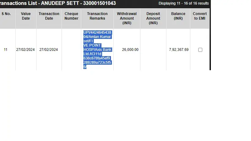 27/02/2024 around 12.05 PM I have made a transaction through google pay UPI of 26000 rs to an AXIS bank UPI (Five point hospital ) the amount got deducted from my account (ICICI) but the amount is not credited to their account. Please chargeback the amount to my account immediately.