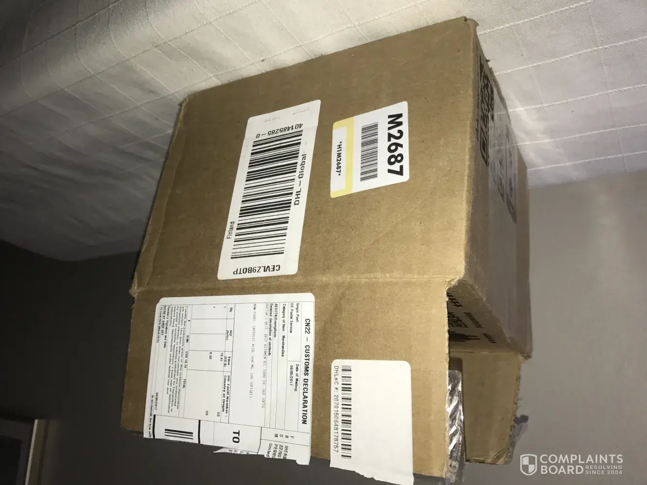 The box was soiled by a leakage from the contents and the parcel delivery man informed me that because of this the box was secured in a polyurethane bag!