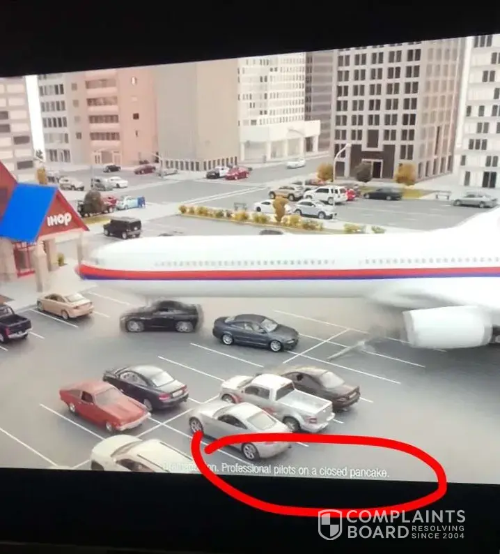 On the IHOP commercial with the plane running into the building the small print reads "Dramatization: Pilots are on a closed pancake." Probably not what you meant. Lol.