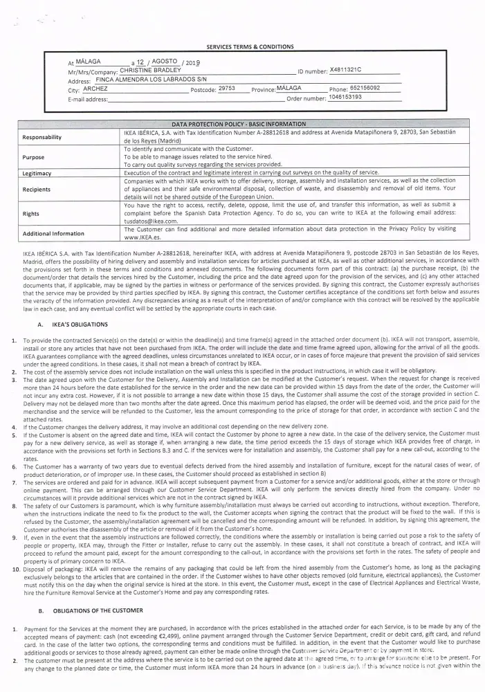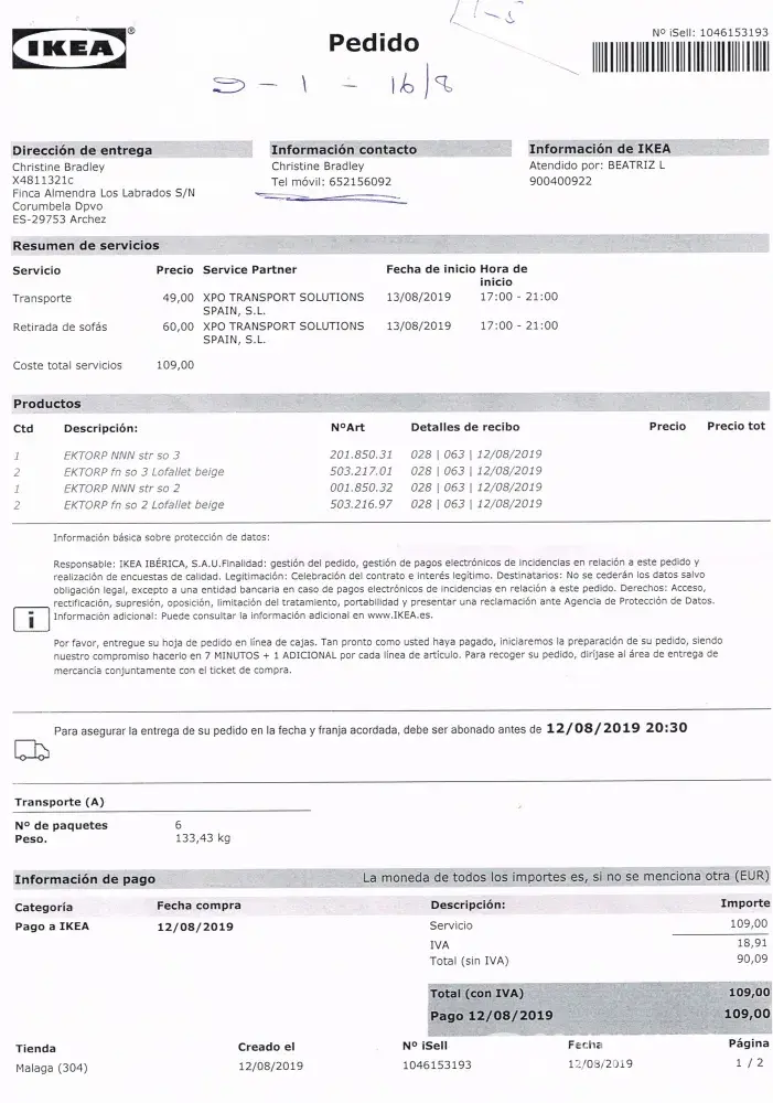 The above order was placed at Ikea Malaga on Monday 12 August and delivery was promised Tuesday 13 August 1700-2100 hrs with an arrangement for the driver to call us so that we could meet and lead him to our house in the countryside. This did not happen nor did we receive any call to explain why. On phoning customer services 900 400 922 no explanation was given only an alternative delivery date of Friday 16 August 900-1300 hrs. We also emailed. Again this did not happen, no communication was made with us. Again we called customer services the only option being given to us was a third delivery date of Tuesday 20 August 0900-1300.