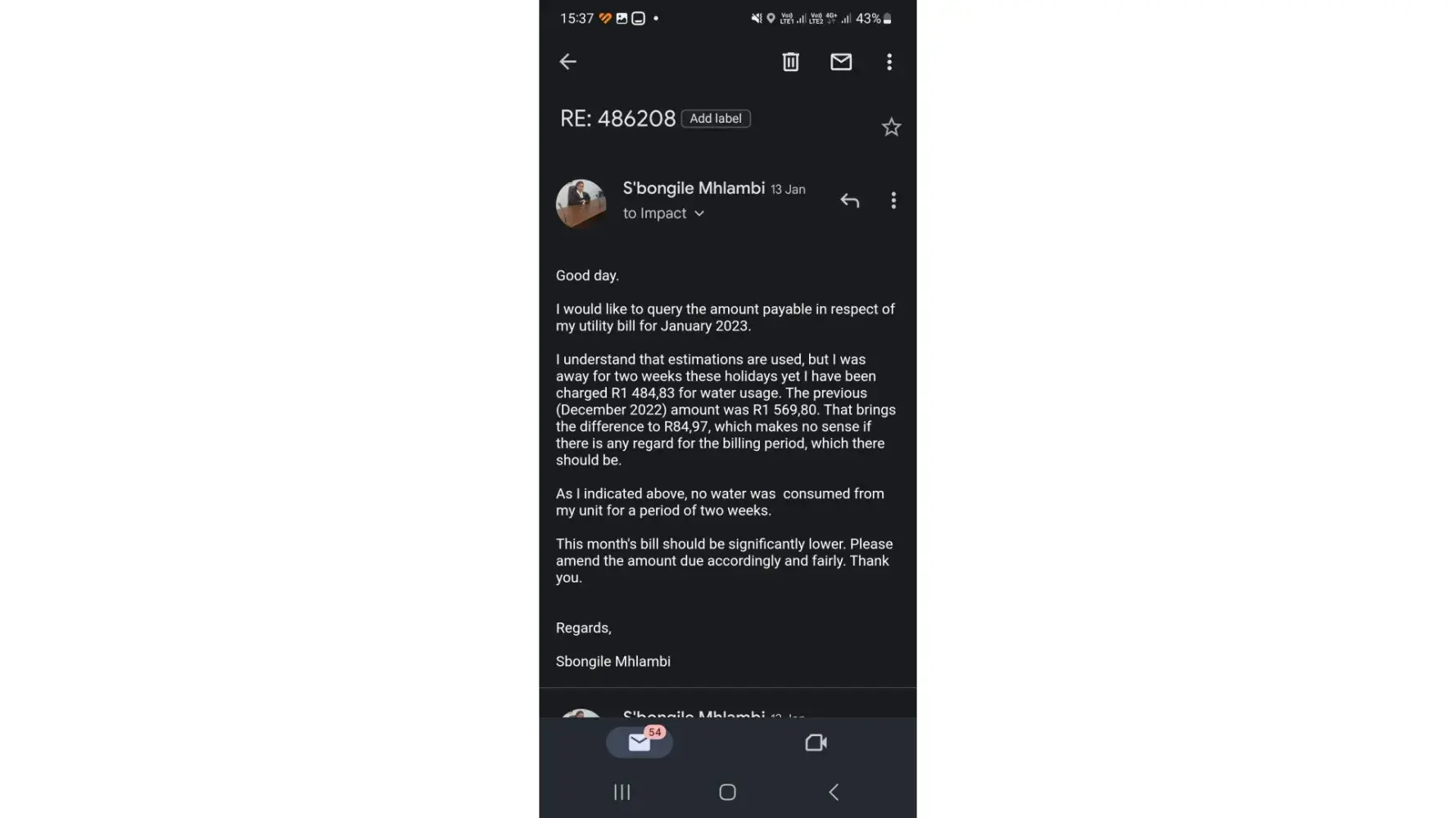 Take note: that I was out of the country from 14 December 2022 – 22 January 2023 and I could not send the water reading during this time for obvious reasons and I did not intimate that there was no one at home during that period, for obvious security reasons.