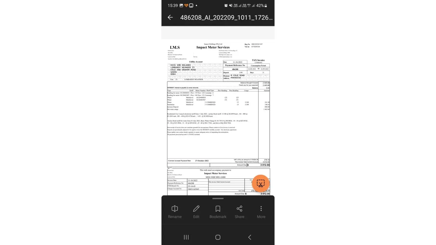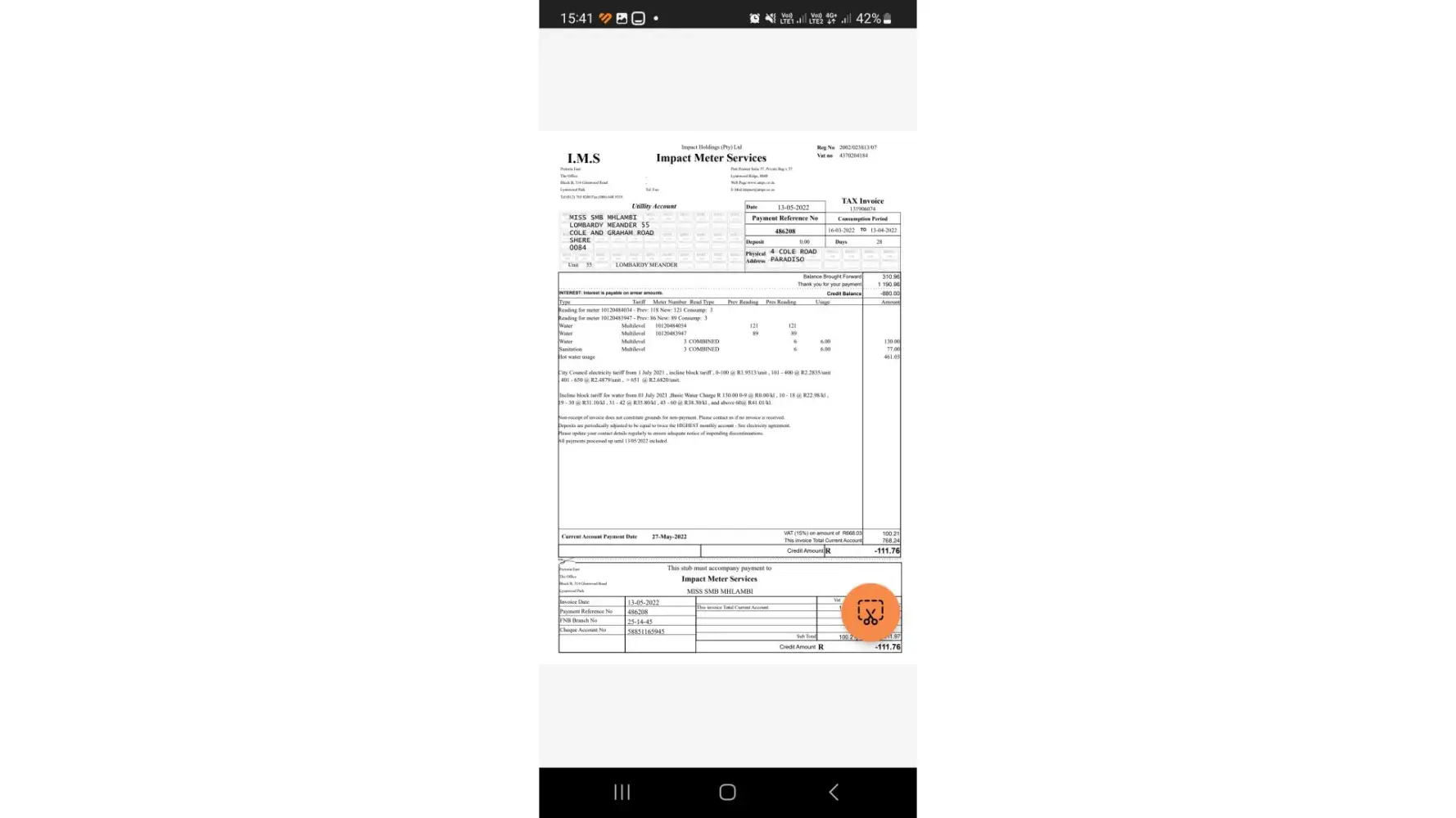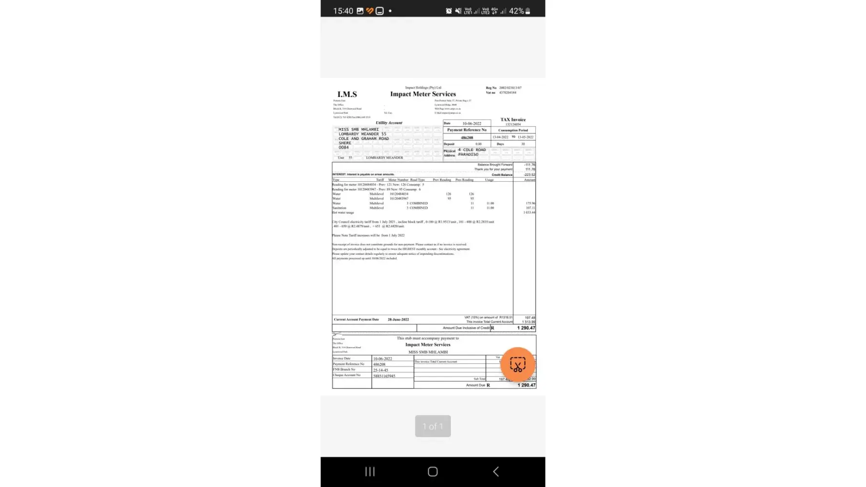 The matter was left unresolved. However, I made payment of the account in full despite not being in agreement therewith and not having the funds on hand, I maintain that the account was erroneously over-estimated. All account consumption the 6 months prior thereto ranged between R 409, 68 to R 661, 72. This on its own should be a red flag on your system, as this indicates my ordinary consumption and an estimation should certainly be within that range, not double thereon.