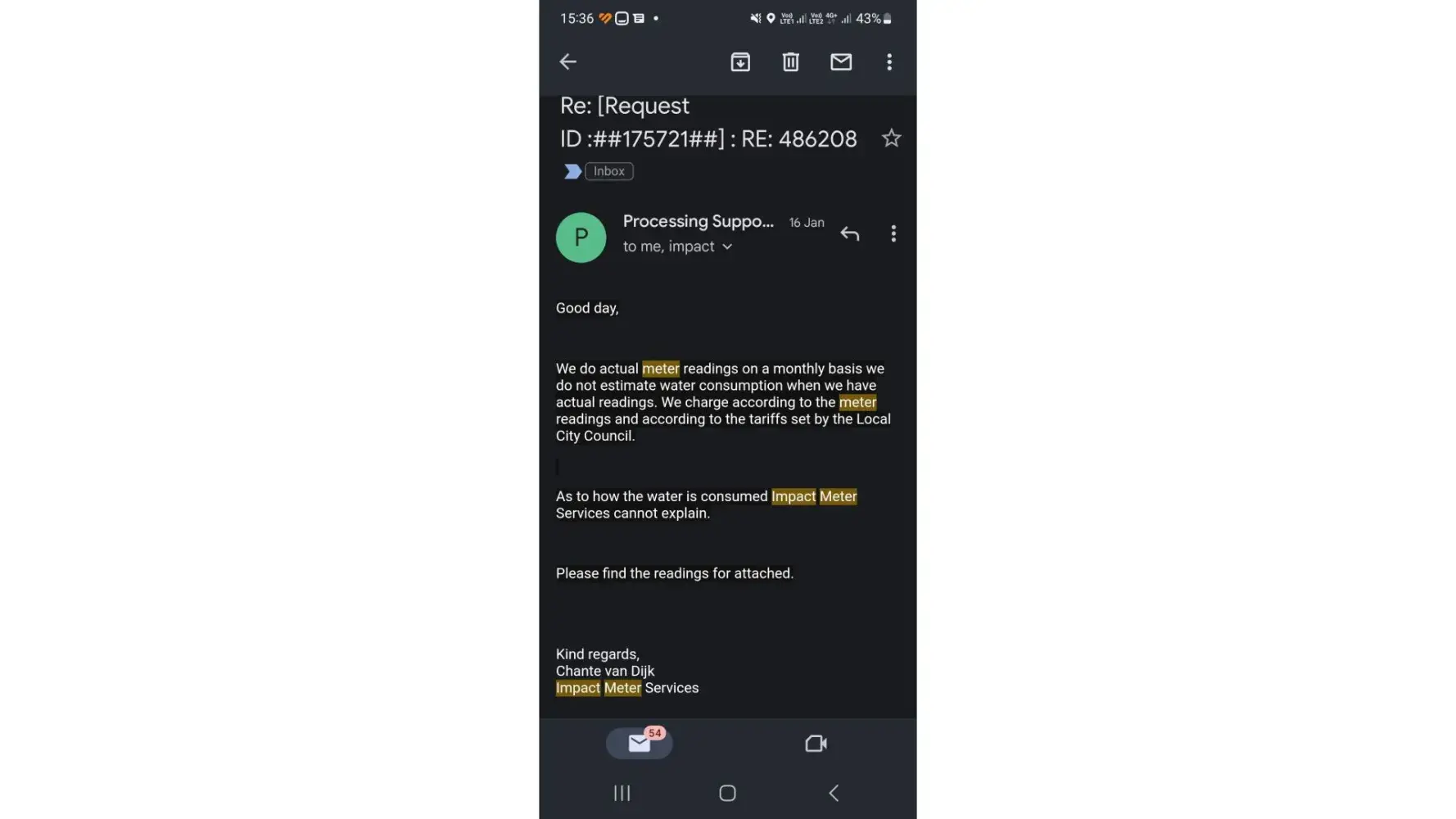 My email was met with disdain. Chante van Dijk indicated that Impact Meters cannot explain how the water is consumed, which was not the question or query. She further suggested that actual meter readings are taken monthly, which I highly doubt because I would not be sitting with this query if that were the case. They use estimations.