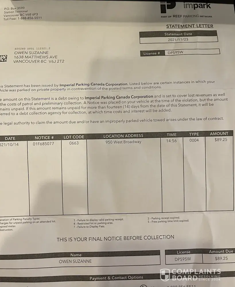 PS even your letter is confusing : it says "payment and contact online, "impark.com " but that comes up as incorrect email address.