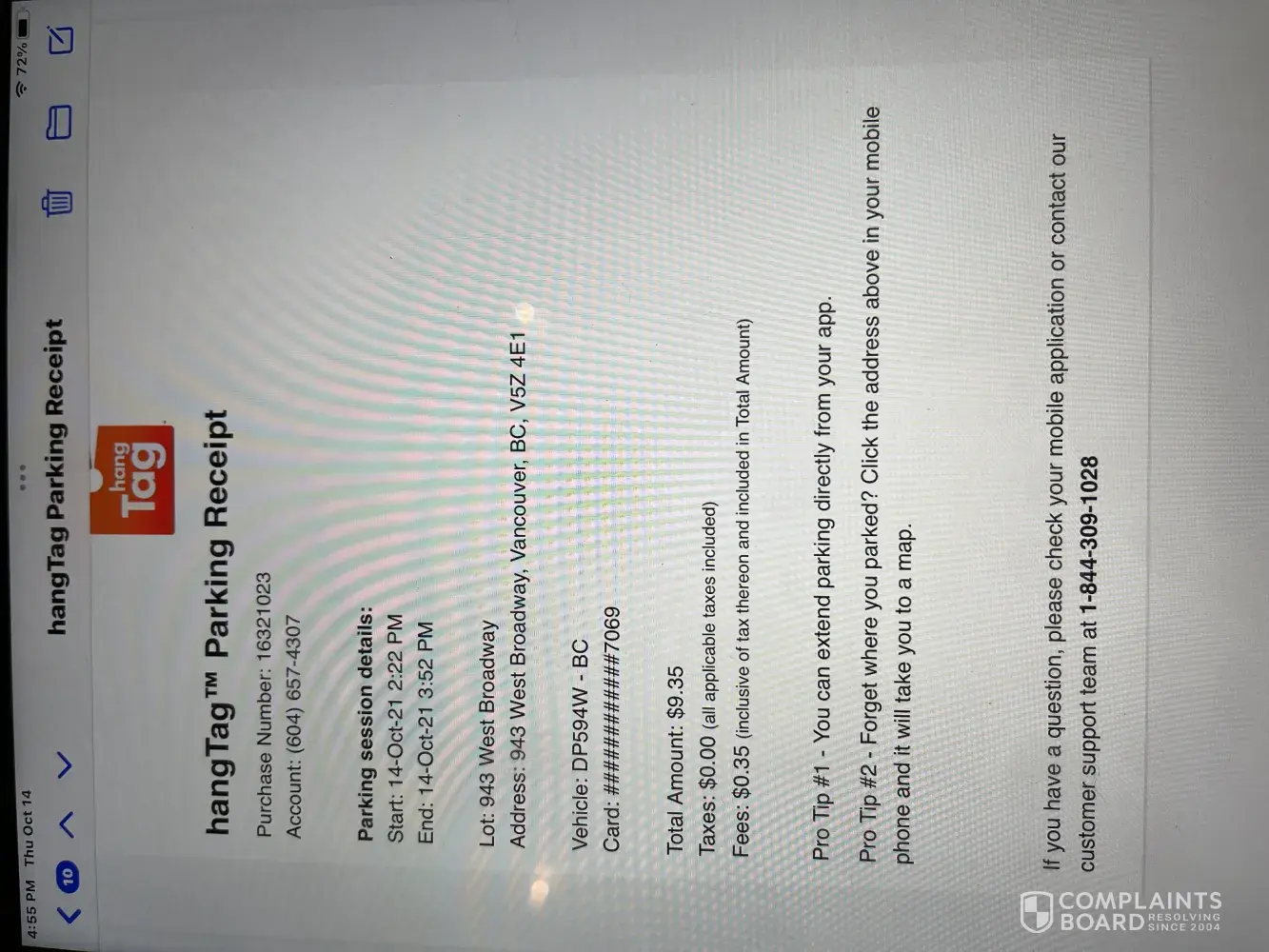 I have already sent the original hard copy of my receipt to you and emailed and had no response . As you can clearly see I was parked at the same time, in the same block …. I unfortunately put the wrong location in when the map came up ( a Very confusing system….why not just a location number on the machine like all other companies do?) I am at exactly the same place and time, just across the road ( I went back to check) it was pouring with rain with no cover and I was rushing to get to the doctor….. The block number came up and I presumed it was the only parking in that block I didn't double check the end of the number . The time is the same, the address was 943 w Broadway, and I thought that the 950 Broadway that came up on the map was the same place . Please be reasonable and look at the time, and at the address and see that it is simply me mistaking the address ( in the same block) on your confusing map.