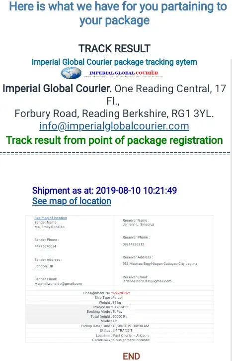 i received an email from a person in EU who had terminal cancer, asking me to disseminate $50 million to charity, 25% will be mine. asked for my address and phone. he provided receipt to validate what he's going to send me and directed me to this website to track the package http://worldwesternglobalcourier.com/. Somewhere between our email exchange he used a company named imperial global courier or the word imperial that is who i got here in the first place and found out that this was a scam. when i checked in whois.com. i found out this website http://worldwesternglobalcourier.com was created just first week of sept 2019. the website is very new. days later i received a text asking me to pay for 15k to receive this trunk from the airport. do not entertain this person. they are usually preying on jobseekers in Linkedin. report the email and website to google. by the way i replied back and told them i am no longer going to pick up that package. she got furious and threaten to sue me. then i received a message saying that the package haa arrived and that i should pay for it. if its too good to be true, google search everything, the websites, the names, the company that will be mentioned on the email, if it doesnt exist or if its a totally new website... its a scam