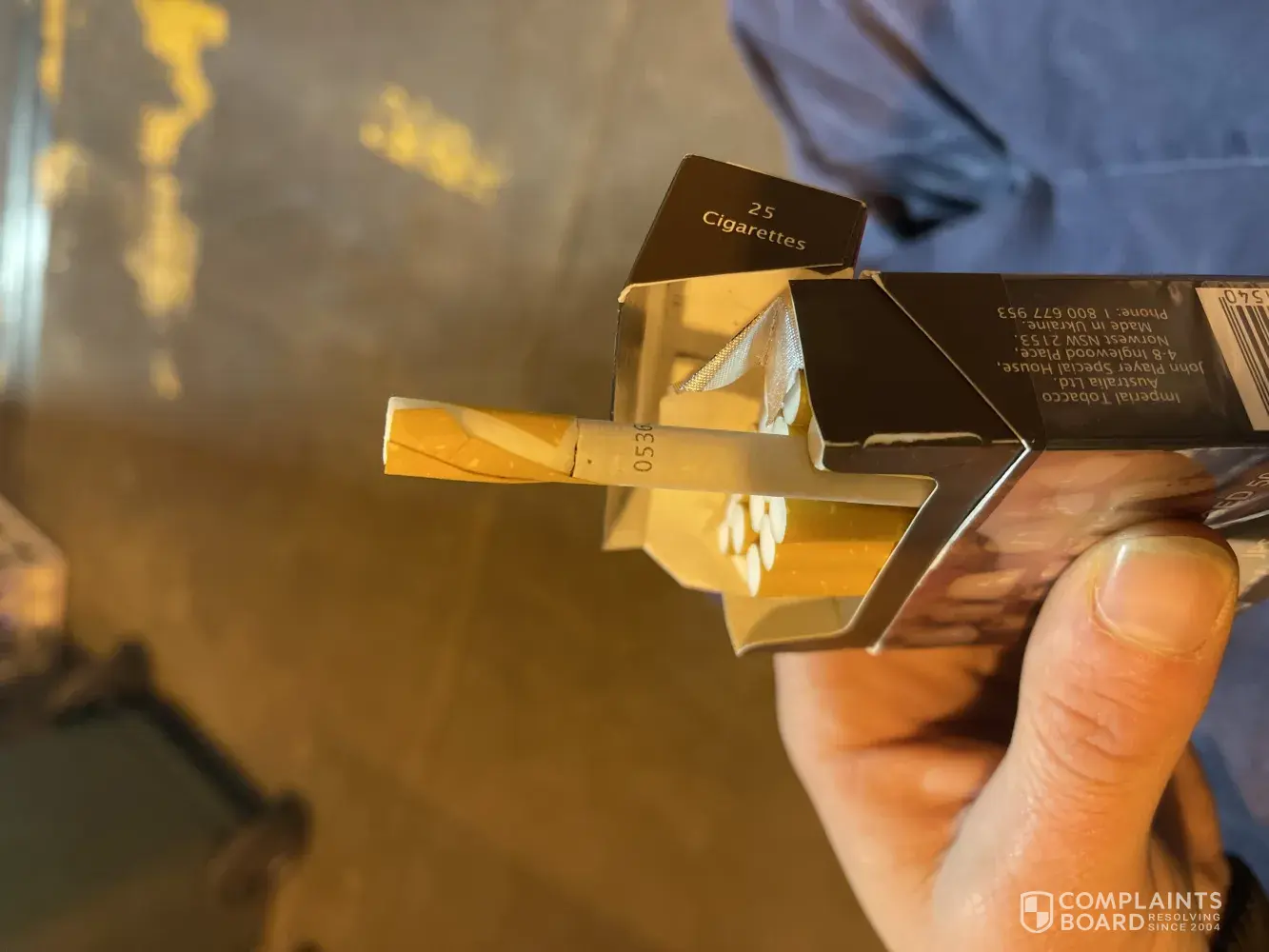 Purchased a 25 pack from the OTR service station, when opened the pack I noticed that a filter on one of the cigarettes was damaged. It appears that it hasn't been wrapped affectively causing it to fold on itself. I've never seen anything like it before and I would hope i don't again.