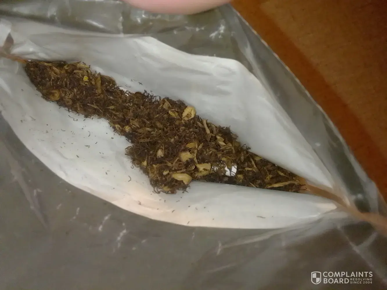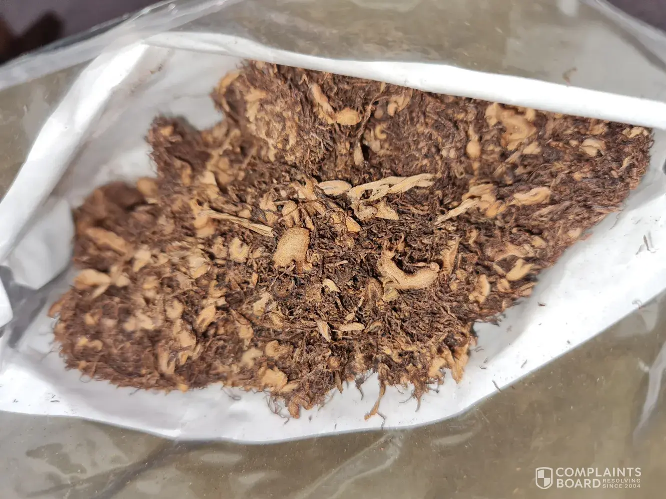 The tobacco is extremely dry with alot of bark through it. So dry that its difficult to roll into a cigarette and either crumbles and falls out the end or is impossible to smoke as the bark won't light and burns out with a disgusting taste. The packaging has been compromised and as a result the product has become stale. I am seeking a replacement as it is a significant expense and I did not get what I paid for. Can you please contact me on how I go about arranging this.