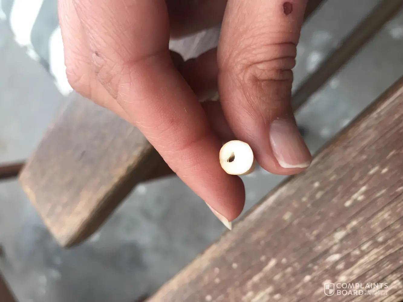 I was rolling a cigarette with my tobacco and as I'm pulling a little pinch of tobacco out of my pouch and placing it on my paper a small 3 piece of rusted chain fell with it and I dont own any chain jewellery and no one has access too my pouch so it has most definitely broken off of a worker or something and fallen into this pouch. I would really like something done about this.