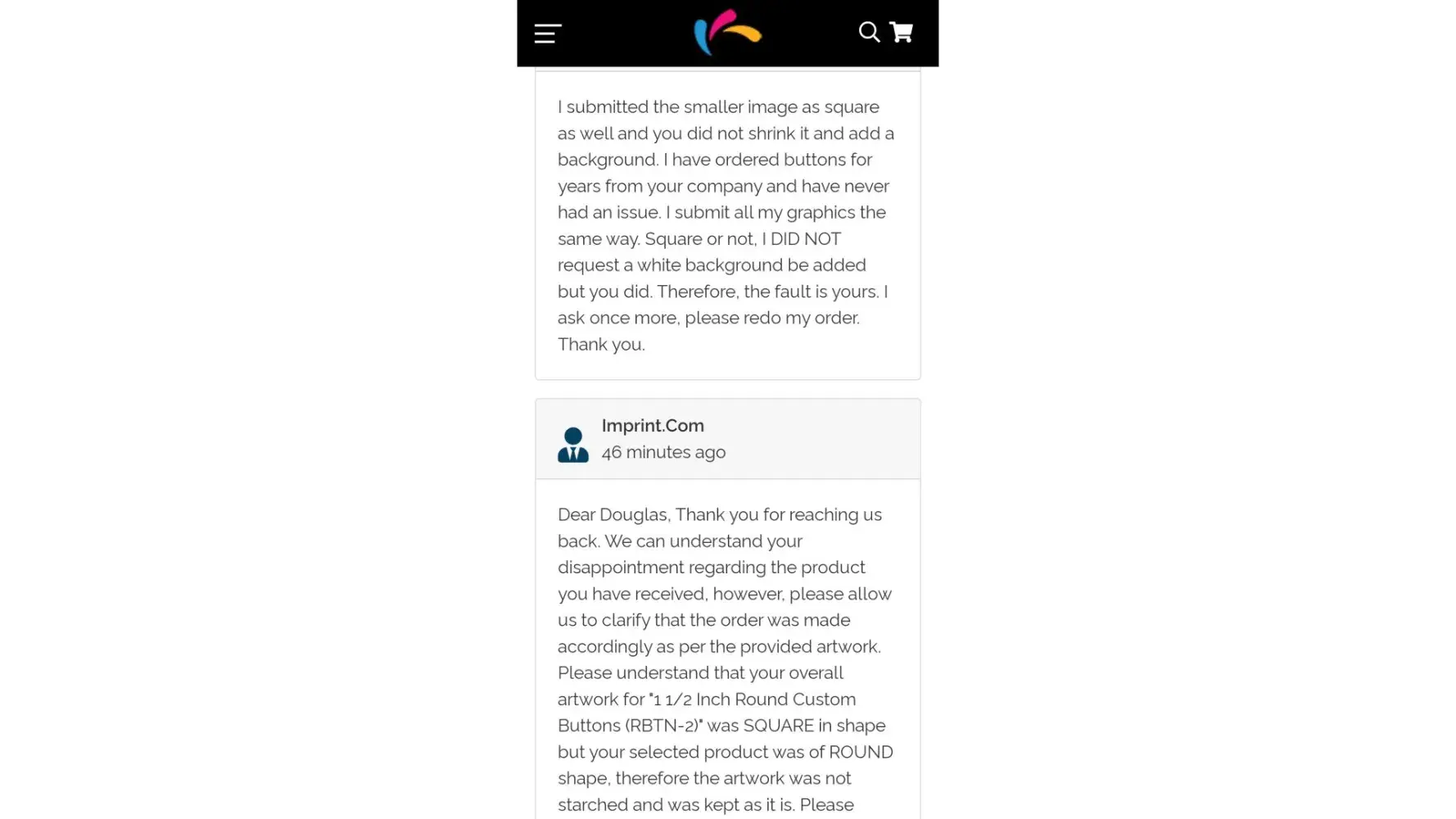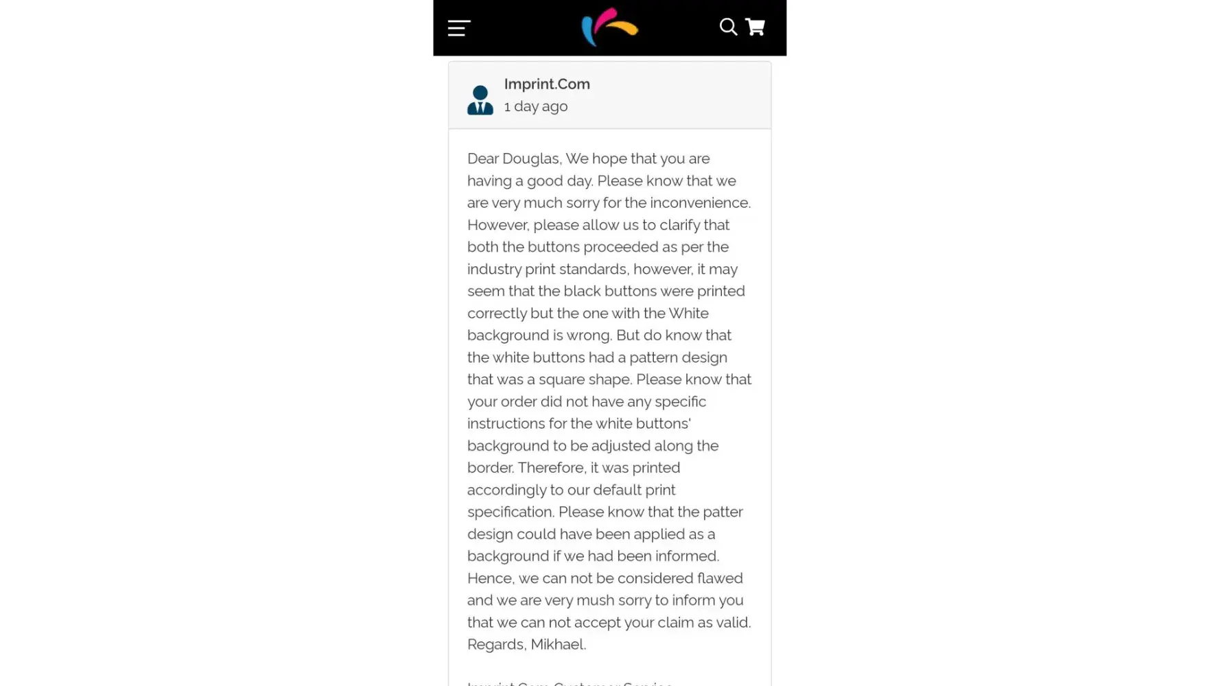 In conclusion, if you or anyone is ever shopping for custom buttons, DO NOT USE IMPRINT.COM. Thank you for your time and attention.