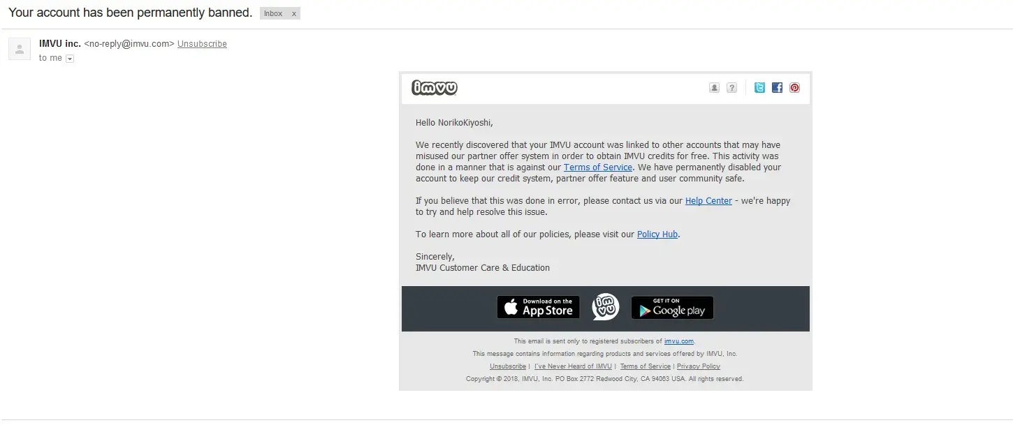 "Hello NorikoKiyoshi, We recently discovered that your IMVU account was linked to other accounts that may have misused our partner offer system in order to obtain IMVU credits for free. This activity was done in a manner that is against our Terms of Service. We have permanently disabled your account to keep our credit system, partner offer feature and user community safe. If you believe that this was done in error, please contact us via our Help Center - we're happy to try and help resolve this issue. To learn more about all of our policies, please visit our Policy Hub. Sincerely, IMVU Customer Care & Education"