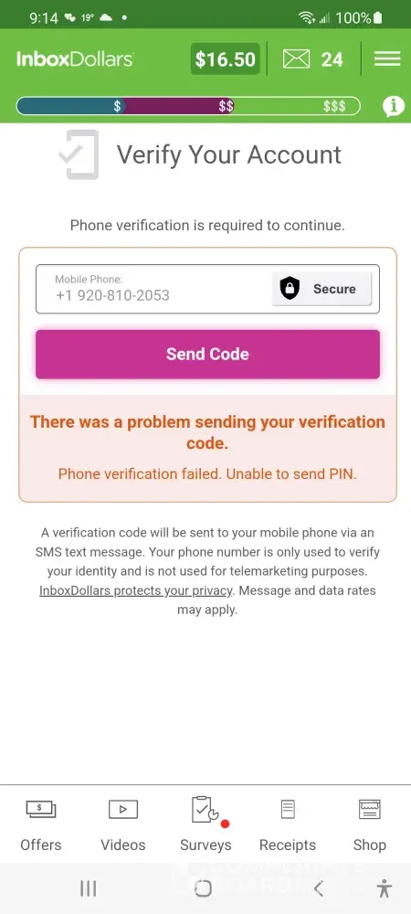 I contacted inbox dollars on June 3,2022 that I couldn't get a verification code so I could get my 50 dollar gift card each time I requested a code be sent to my phone I kept receiving a message that my call could not be completed I contacted Inbox about the problem on June 4th I told them I could not get a code they still have not fixed the problem