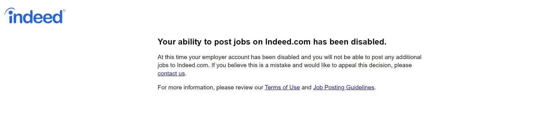 Indeed must be the worst company i have ever dealt with. I called their customer service and dealing with them is a nightmare. There is no reason my account should be disabled. I gave them all my sensitive business information that they requested. Even the account advisor does not know why the account was blocked and blacklisted. She advised me to open another account and again without any warnings and this time not even asking for anything just disabled the account again. DO YOURSELF A FAVOUR. DON'T TRY TO POST JOBS ON INDEED. They will waste your time and won't resolve anything. Try posting on facebook, kijiji or another job posting site. BTW don't blame your employees at first i thought it was the employees who were just not capably of opening this account but it is clearly INDEED. AVOID LIKE THE PLAGUE.