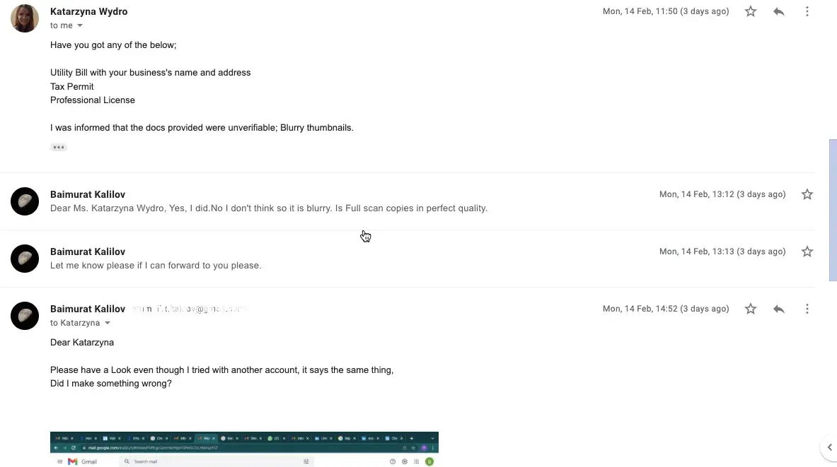 *First, I tried gmail account they blocked, then I did with another account, again they blocked. From my side I provide everything. They asked me "Utility bills with address", "Tax permit", Company license, even I showed them our registration paper. But it is denied, I asked "Why"?, They said "It is blurry".