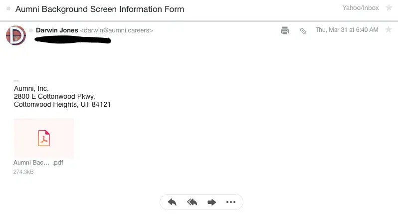 Mr. Jones, I received this email. They are using your name in the email address. darwin@aumni.careers with the contact name Darwin Jones. They are emailing a form for background information with your company name and a St. George Utah address. FYI