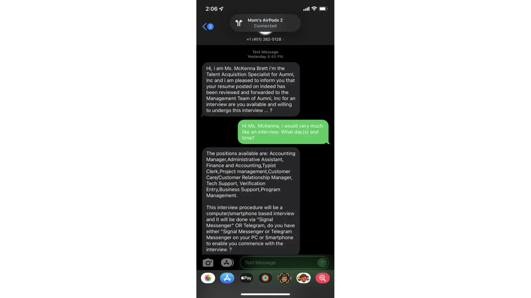 I was contacted yesterday from a McKenna B via text, to chat with Adam Fantino. We chatted yesterday with what seemed to be a standard interview. I was advised to come back to chat at 8:30am my time. And be prompt. I was then advised they would like to move forward with me. I received an email from Danielle Kelez. My 1st fraud alert went off when in the email it had NO company markings logo phone number only address. That is it. The next flag was asking what bank I use, not the account info just name. Then I was advised I would be paid via check sent to me. During this time I’m google the “people†who I have chatted with. During this COVID craziness I started taking Goggle cyber security classes so I’m looking at all the signs at this point. In my digging I found the 2 ladies name however never found Adam Fantino. The final straw was advising me I would need to go to Verizon or ATT and get a new line and the phone must be an iPhone 13 proMax 256 GB. I don’t have any fancy degrees but at this point every thing is screaming SCAM. I was told I would be paid for the money I spent. At this point I end conversation with “Adam†and proceeded to dig more. I go as far as to email 2 people from LinkedIn. I didn’t get a response but they should be aware these people are legit trying to use the company likeness and that of some of the major people working in the company. I’m glad I was diligent in looking up this company. Sad because it puts a bad energy out there to real employees working on behalf of the real talent acquisition team. And I think I my have sent Mr Darwin a message on LinkedIn.