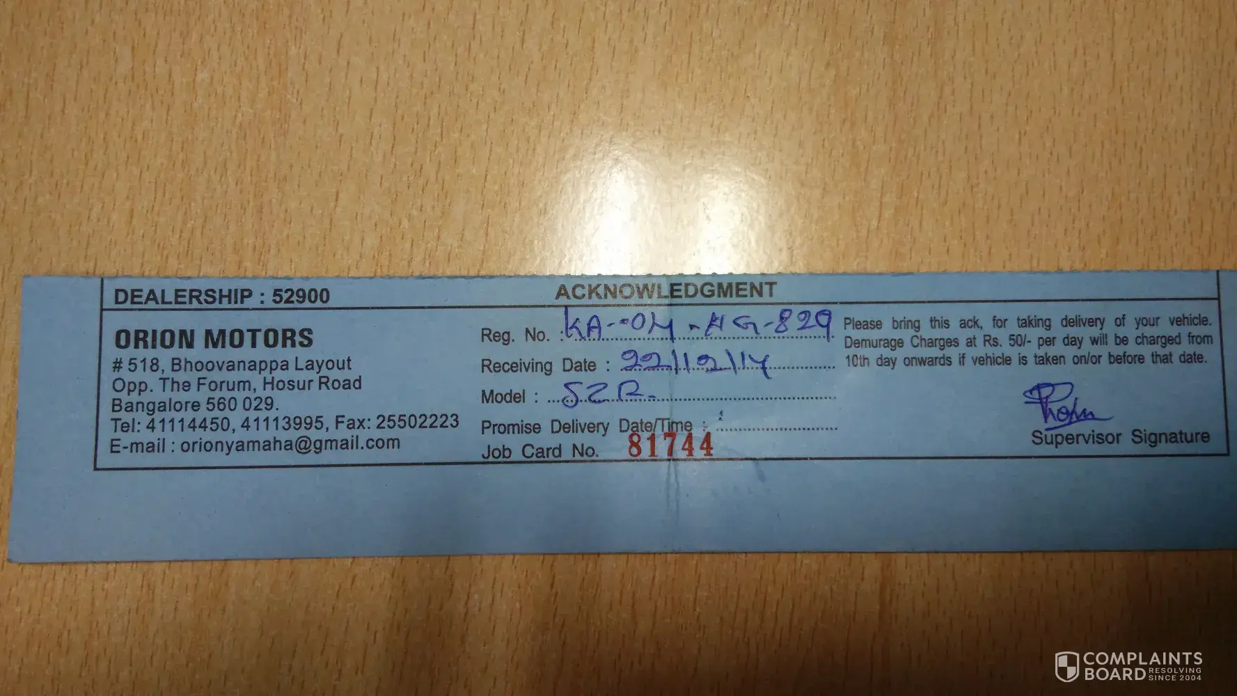 yamaha motor - bike service complaint against orion motors, bayamaha motor - bike service complaint against perfect riders, bangalore 26/11/2009