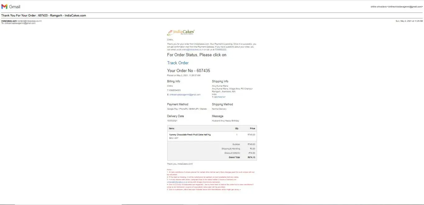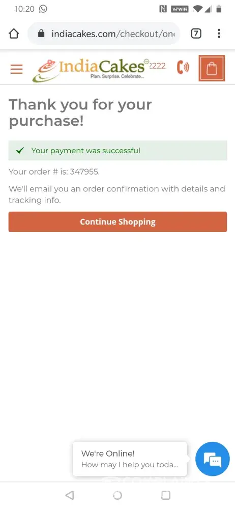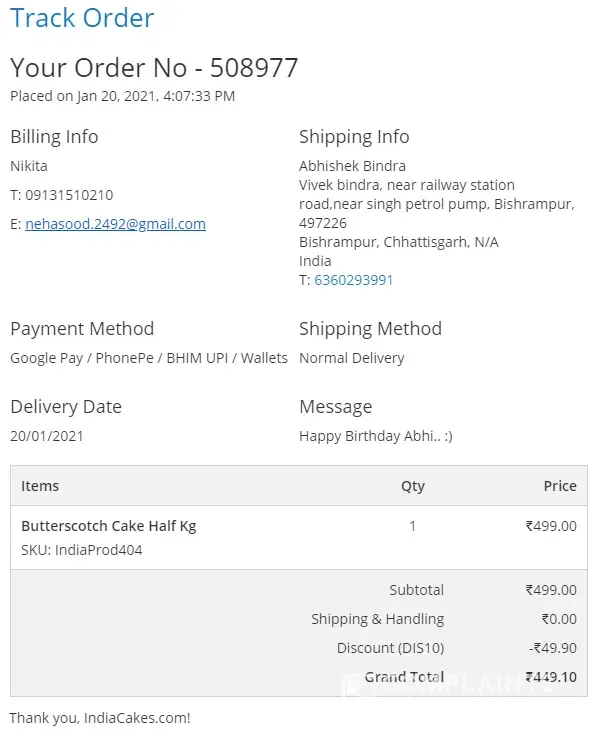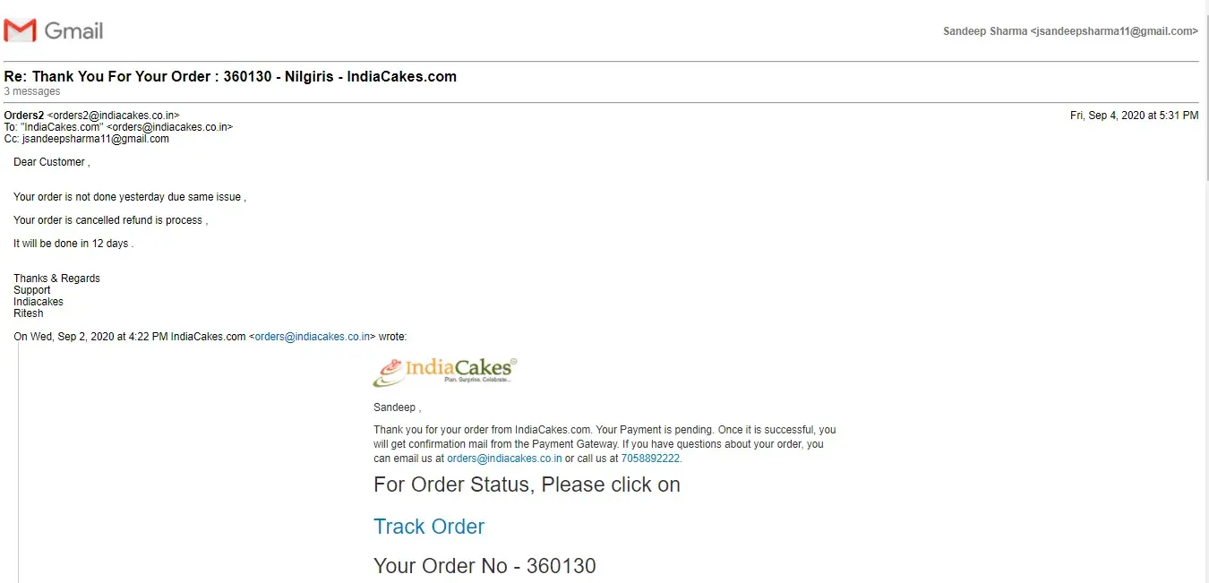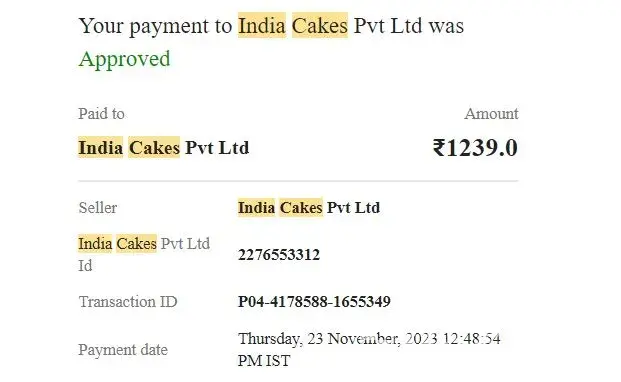 As it stands, my money has been deducted, the order remains undelivered, and I have yet to receive any communication or resolution from "indiacakes.com."