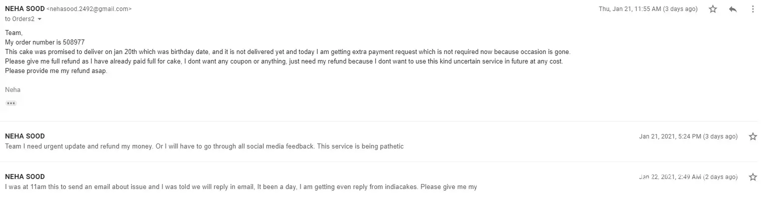 I placed an order on 20 Jan and they promised to deliver the same day. They did not deliver the cake on 20th Jan before 9 pm and my friend had to buy another cake after 9 pm then I called indiacakes.com at 21 mornings and they informed they you have to pay more 200rs to deliver so I said cake is not required now, do not deliver, I want my refund, they said drop an email we will revert, I sent 3 emails on 21 but no one reverted, I called again on 22, but they shouted on me saying - there is no refund policy, and you placed order at 4pm and expecting us to deliver same day and you did not paid extra delivery charges and they said let me add your call to receiver, we have your receiver number, and ask them how far they live to deliver, they tried to include and insult in front of the reciever . Literally that lady-sunita shouted on me like anything, I am attaching my recorded call and email what I sent, they does not even 0 star.