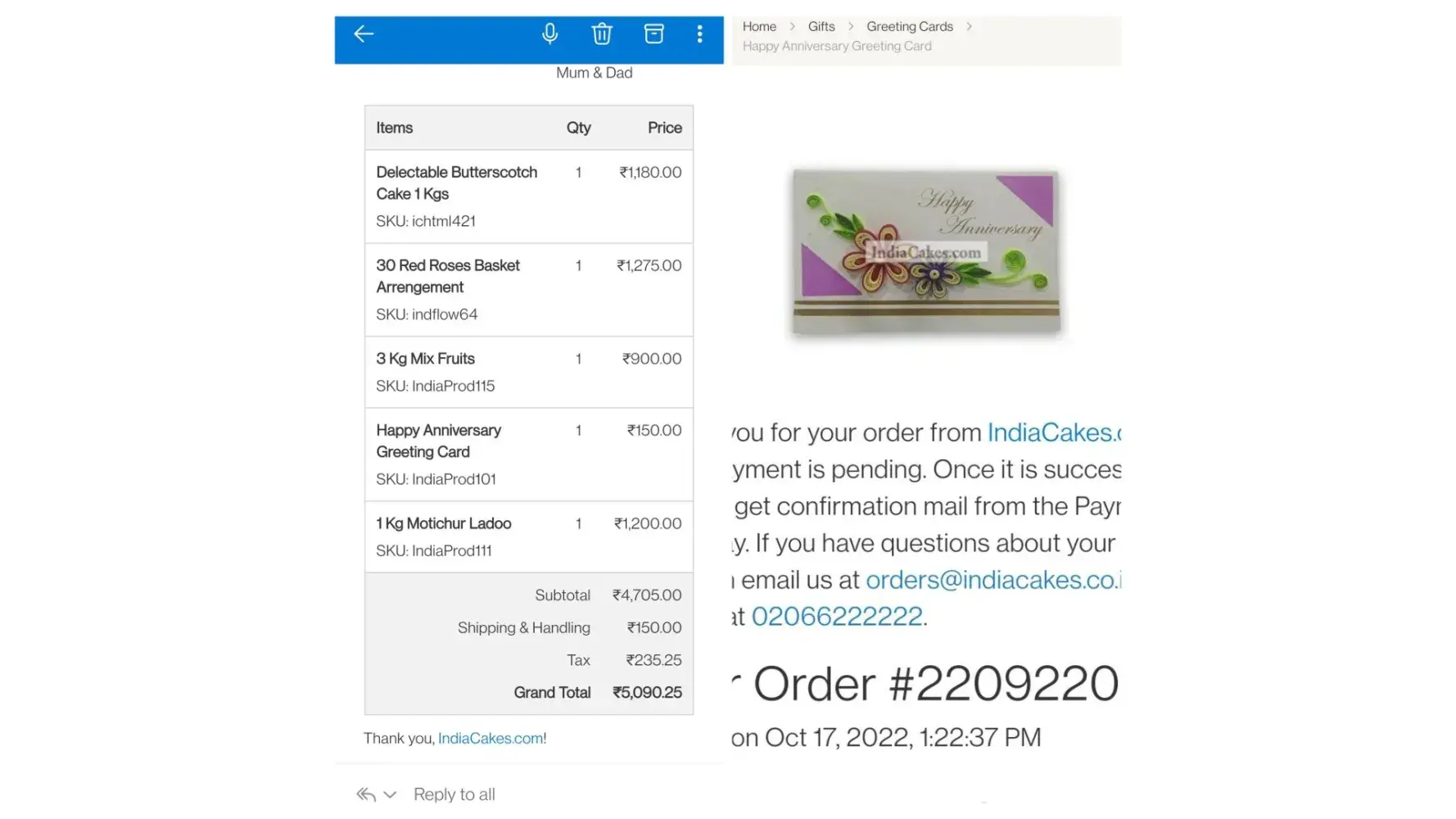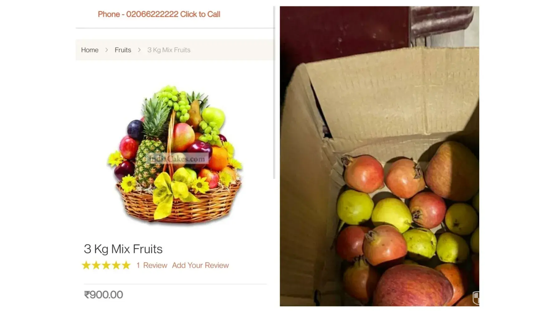 I placed an order a day before for a timely delivery and paid extra about 300rs but what my parents received was shocking next day as late as next day night ruining their 53 anniversary celebration with no cake in the party plus the flowers, sweet and basket of fruits. I was shocked to see what I received next day at night. They are frauds and posting fake pictures. They charged me so much and also paid extra fee for timely delivery but products reached at night the next day after many disconnected calls from them and 5 emails. I was shocked to see what I ordered and what they delivered. Why these companies are not providing the refunds and failure to comply the section under "products and services ' and still running their business after what I saw online posted so many reviews for the fraud services they are offering and then don't even apply the refund. Probably consumers need to take strict action on these scammers for what they are providing. Please see what I posted and what they delivered and on top they charged me extra for the rediculous services and failed to offer the refund due to not responding to my emails and disconnection the calls I made. Order number is provided in the photos as below with the comparison what they are showing and what they are delivering. Not even the greeting card they provided they charged extra 150 in addition to timely delivery and packaging was shocking.