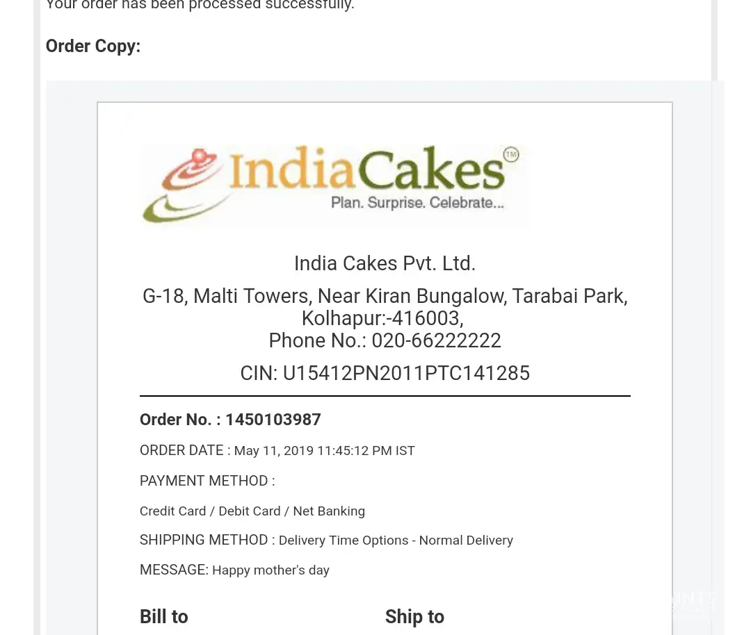 Hi, I ordered cake from indiacakes.com which cost 800 rs including the delivery charges. The cake seems to be looking very nice in the internet, but they ordered the cake from local city bakery for which quality is not good to the paid amount. I called the bakery by phone and asked them the price and I was shocked. It's cost only 180rs. They are really a big cheat. After getting too much money, simply they are cheating us. Rather than purchasing online, we can simply go to nearby bakery and order it. So I request all consumers not to purchase online especially from indiacakes.com. They are big cheat.