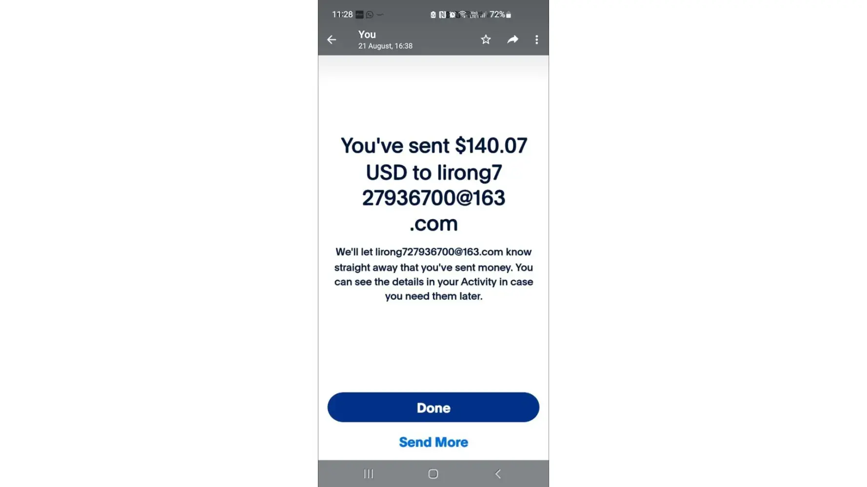 Made me pay via PayPal friends and family so can't claim back from them. 21/08/2023.. £120 gone. Hateful little scammers lirong727936700@163.com