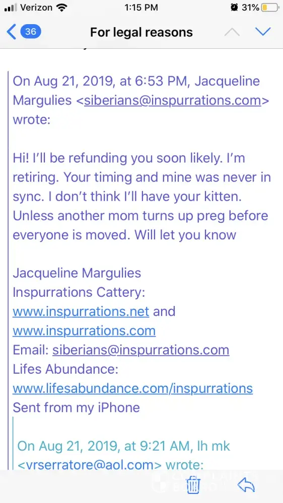 I have almost 2yrs of correspondence with Jacqueline Margulies (the owner) where in I'm given the run around, never given a kitten nor returned my deposit.