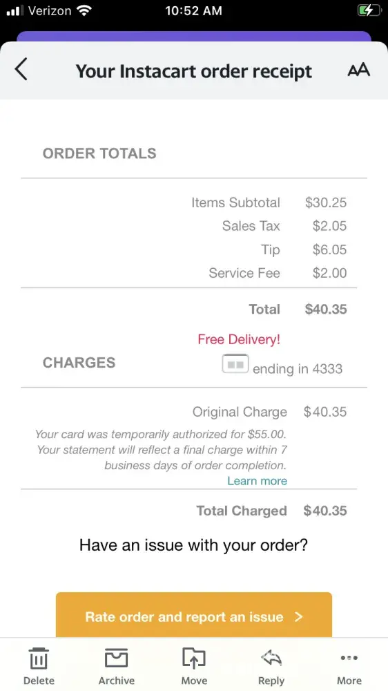 10-15% more just in case there are substitutions, but it took $55 for a $40 bill (that's with fees and a 20% tip) from my bank account despite the fact that I attempted to pay with $50 ApplePay, the service it requested that I use. Instacart plundered my bank account instead (I don't know how it had access). While Instacart eventually returned the stolen $15 (an extra 40% to the total bill, 80% more than the cost of groceries), my account is overdrawn due to Instacart's fraud.