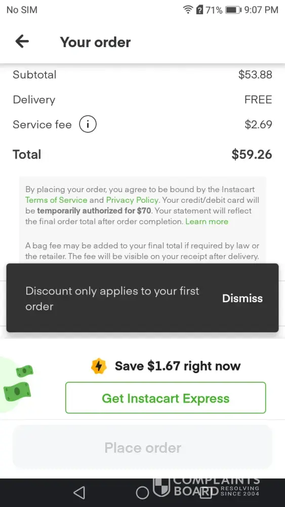 Would not honor $20.00 off offer for next 3 orders in Instacart email or a $15.00 offer off next 3 orders. Reason given was that I already had used a credit. Credit was $2.80 that I was overcharged on a previous order and I could not use more than one credit per order. What a bunch of BS. I'll go to the store from no on, nothing but a bait and switch from a lying cheating company.