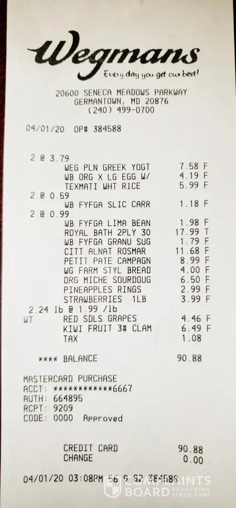 I am a 79 years old, under mandatory home confinement due to Covid 19. I placed order with Instacart on 3/30/20 for groceries to be shopped at the Germantown, MD Wegmans. Instacart delivered on 4/1. They charged $130.64 before tax, where the receipt from Wegmans shows $89.80. I discovered their scam because the shopper left the Wegmans receipt within the...
