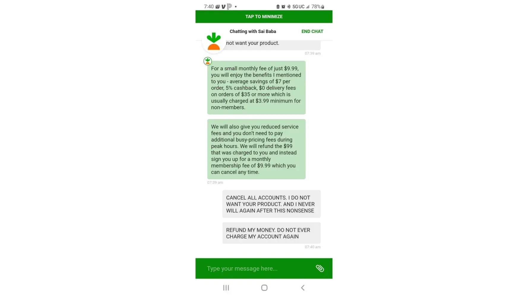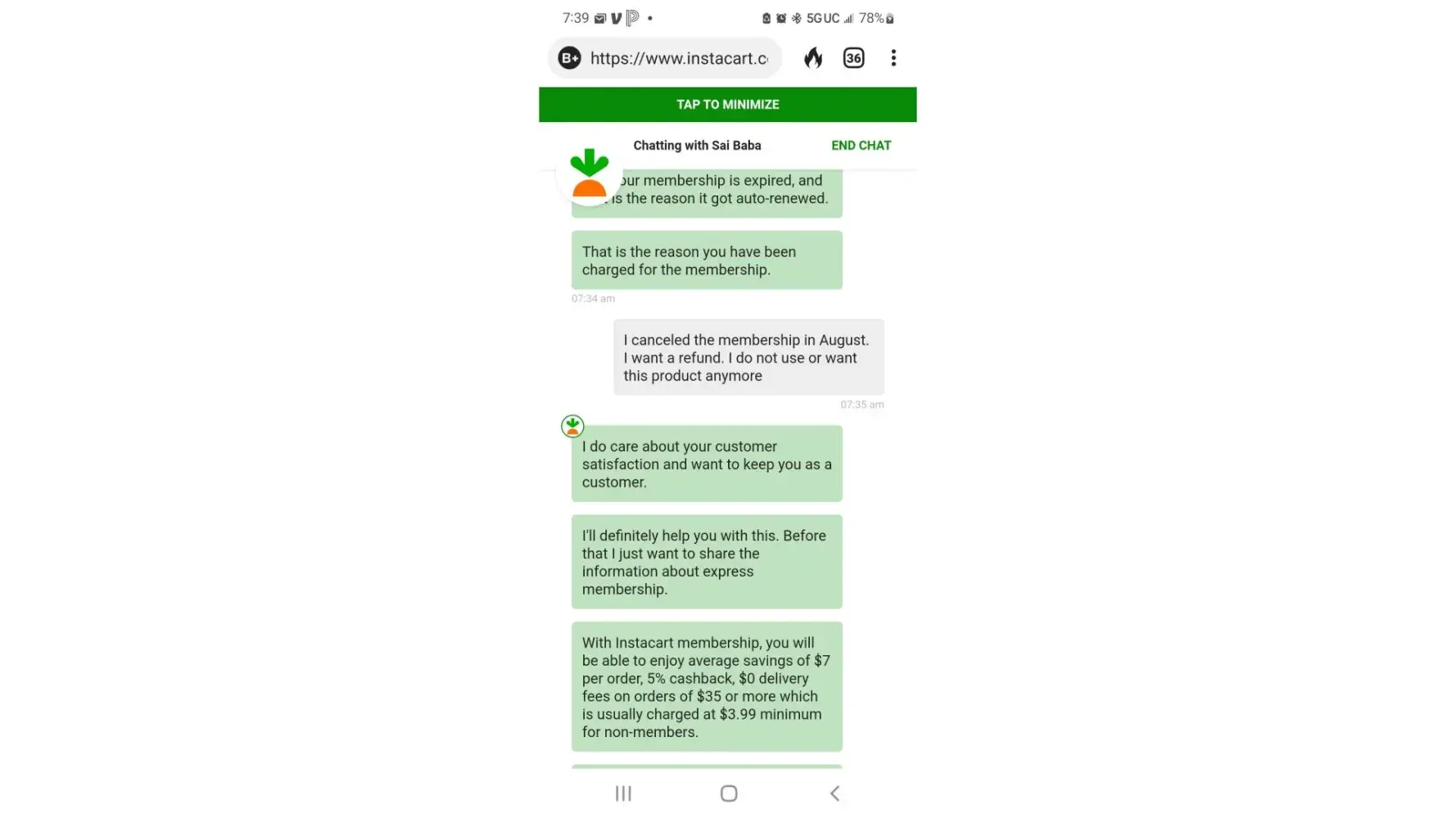 Instacart automatically renewed my membership, even though i had canceled it in August. I contacted them October 20, 2022 to cancel my membership yet again. The agent made it extremely difficult to cancel. He continuously attempted to sell me the product after I made it very clear several times I was not interested and wanted to cancel. I have screenshots of the entire conversation.