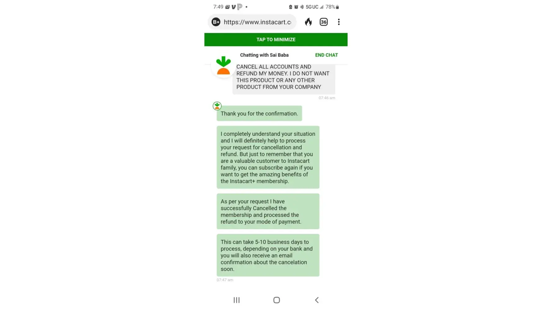 Check your bank account for the refunds! They have stolen over $100 dollars from my mother, instacart reps always say they will refund the money but they never do! I am currently working on submitting my own complaint! It is outrageous how they don’t support they consumer that make their company run. 98% MALE shoppers buy about to expire veggies ( if they pick the right one) and they usually opt for REFUND rather than look for the item for a replacement. INSTACART needs to acknowledge the consumers complaints.