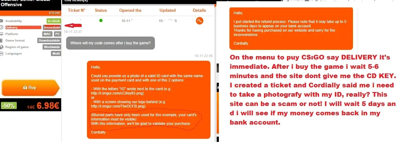 Ordered 15 games so far, all of them came instantly. Sometimes they ask for your ID next to the logo for security reasons but that's solved quickly and it comes with their apology for the time you had to wait. All they need is to see the name matches the name on the credit card so you can use Paint or something similar to hide the other info. Extremely professional, great prices, instant games. Highly recommended.