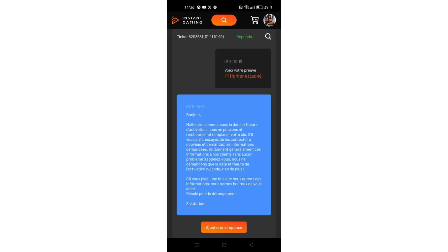 Il mon envoyé un code qui lorsque je l'ai acheté avait déjà été utilisé par une autre personne. Cette confirmation à été fait par les services Xbox. J'ai envoyé la preuve que Xbox m'a donné à instant gaming, mais il veule une heure et date que Xbox ne peut pas me remettre par confidentialité des clients