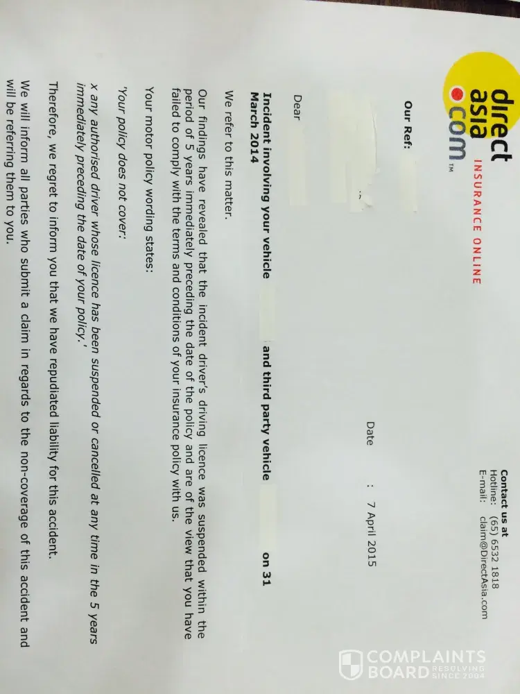 I am writing to share with you my unfortunate experience with Direct Asia Insurance Pte Ltd. My family had a car accident end March this year, but when we filed our insurance claim with Direct Asia, it was rejected under the following policy wording: ‘Your policy does not cover any authorized driver whose license has been suspended or cancelled at any...