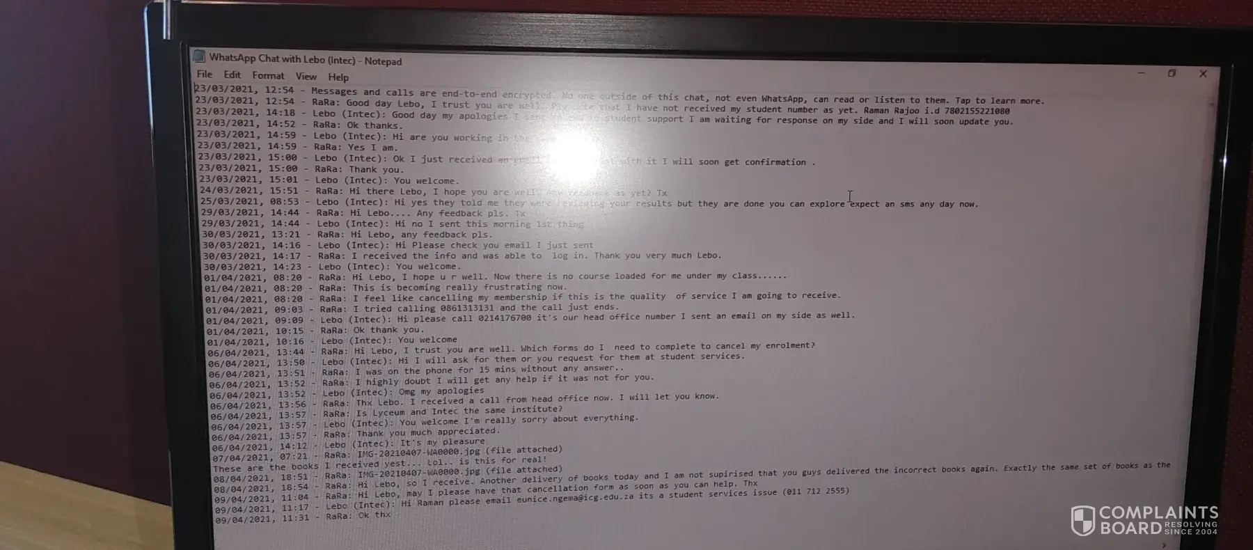 Second post about intec college.I registered with this college for HR and received the incorrect study material. And was registered for the incorrect course. All they send me is money that needs to be paid. As I am waiting for my refund for my deposit. All they tell you is busy with investigation. When I phoned I was told it would take 3-4 working days. We are now in the next week. This is pathetic. All I want is to cancel my studies with Intec college. But the process is dragging now. They deduct money of your account which is the incorrect amount and then lyceum college which I never registered with sends me I need to pay my studies. Do not make the same mistake people please be warned.