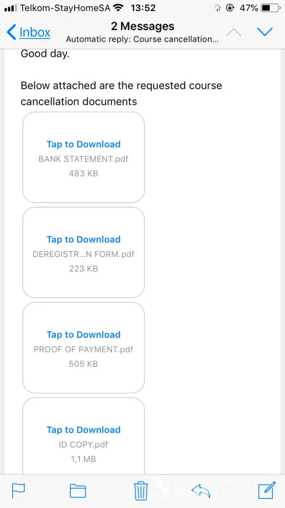 Throughout this whole ordeal I've not once had access to any study material as I had no access to my student portal. Since 12 March 2020 I had been sending emails stating that I kept having issues logging and that I kept getting an error message (please see attached). By 10 June 2020 this was still not resolved, that is basically 3 months later (please see second email attached).