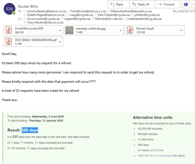 I sent multiple emails throughout this time to claudine.[protected]@icg.edu.za,