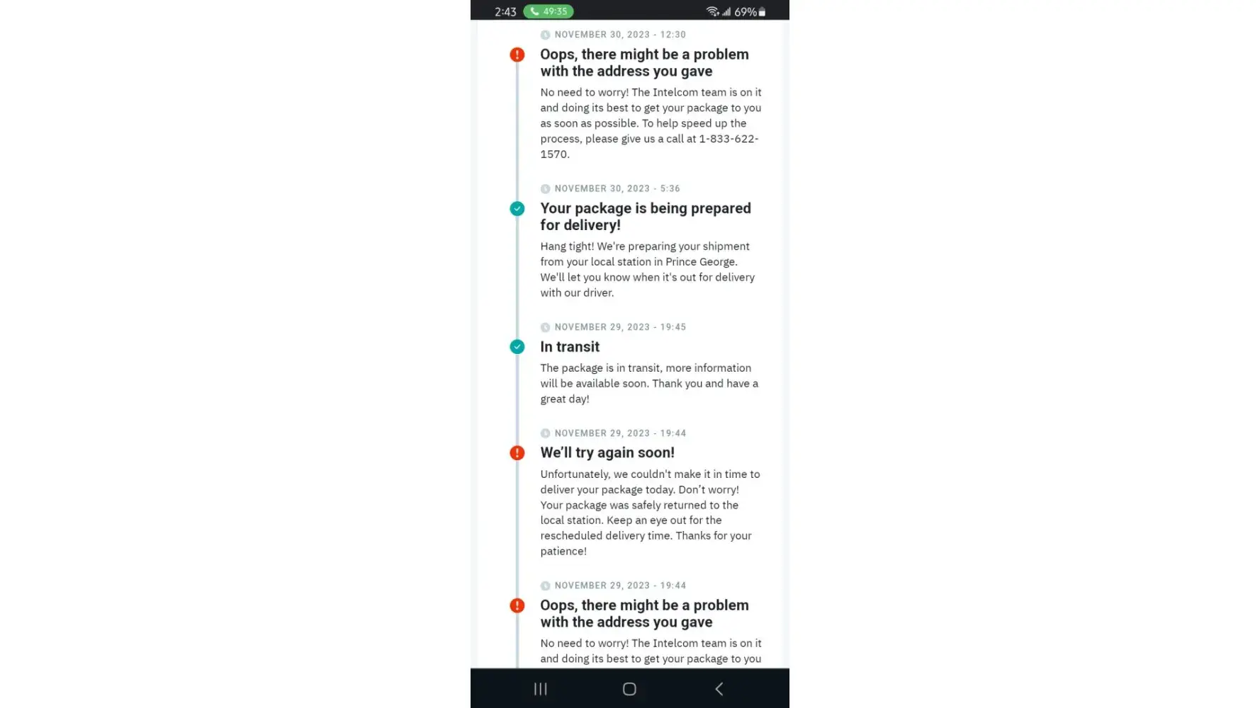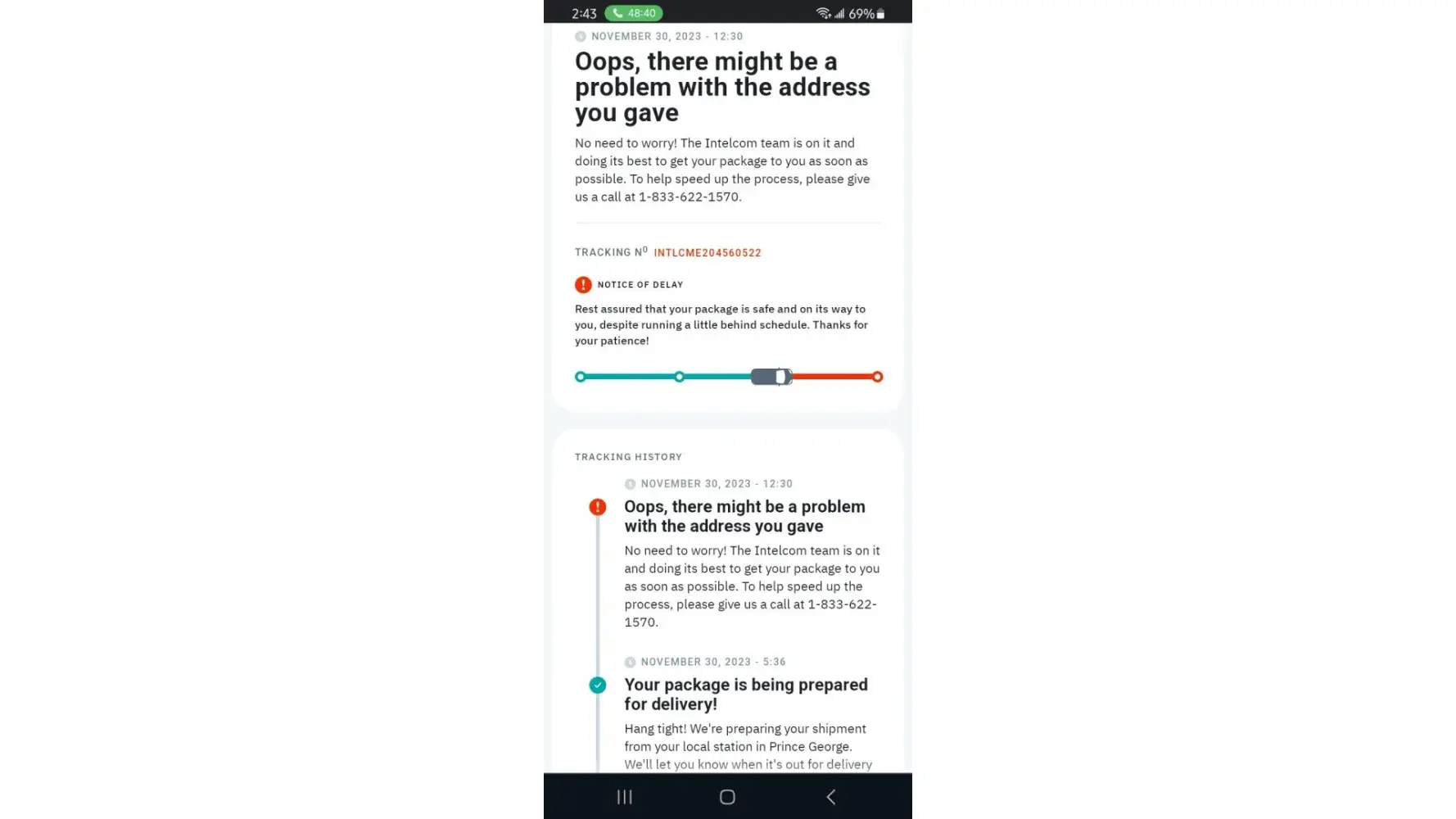 On November 15th I got a notification that the package will be delivered in 3hrs. Never got it. When checked the website next day November 16, there was a message that I gave a wrong address. Intelcom was delivering to my house for over 3 years since we moved here but the address exists for over a sentury. I phoned the company and confirmed that my addre...