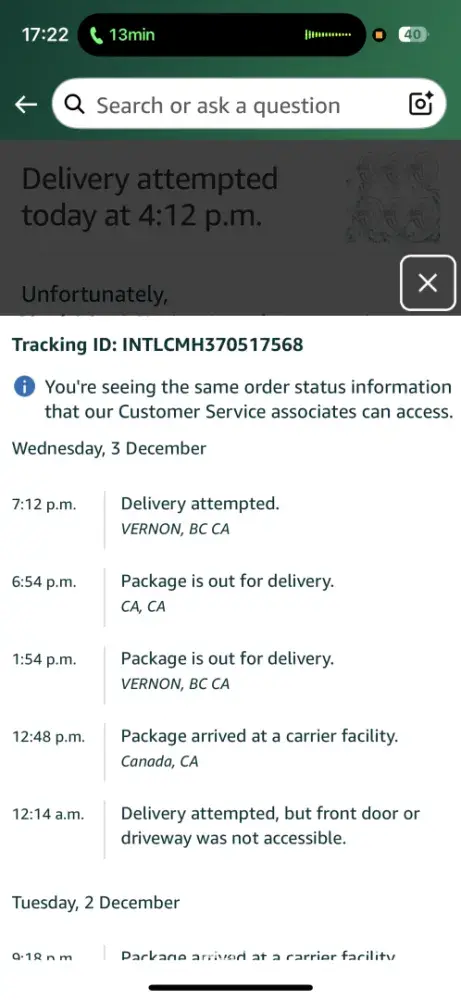 When I ordered my Amazon order it was expected to be delivered to Kamloops on November 21 and on the 22 it said it was delayed due to severe weather. Looking at the Intelcom tracking the package arrived in Kamloops on November 21 at 5 am and I can confirm the weather is beautiful in Kamloops on the 21st and 22nd, no snow or rain, just sunshine. What is going on?