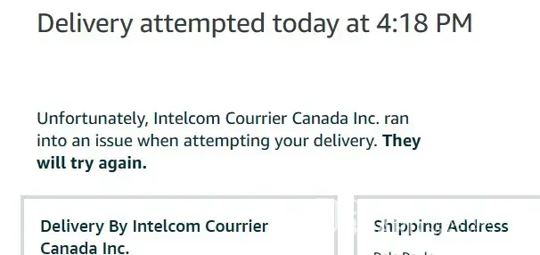 For three days straight they have lied and said they attempted to deliver my parcel but I've been home every day, all day so I know that is a lie. They did the same thing last summer for two weeks and Amazon told me they would stop sending my parcels via intelcom. For awhile Amazon did stop using intelcom but now they are back to intelcom and poor service.